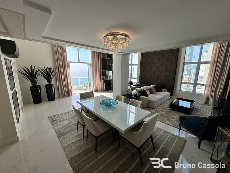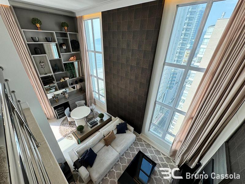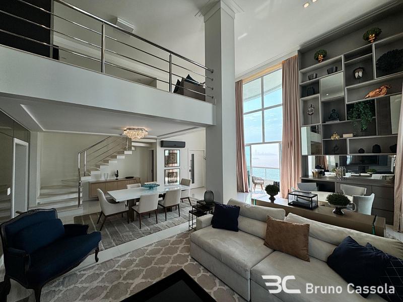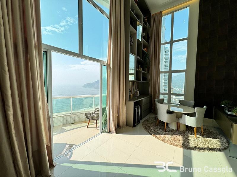 Apartamento duplex com vista para o mar, 256 m² privativos, 3 suítes sendo uma master com closet e hidromassagem, amplo living com pé direito duplo e varanda externa com churrasqueira a carvão, mezanino estendido, home office, 4 vagas de garagem. Apenas 1 apartamento por andar, com face Norte e maior luminosidade natural.