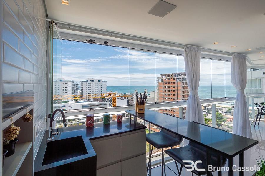 Amores da Brava: Apartamento todo mobiliado e decorado, com 114,64 m² privativos, planta inteligente 3 suítes (otimizada para 2 suítes + amplo living com vista do mar), sacada externa com churrasqueira a carvão e 2 vagas de garagem.