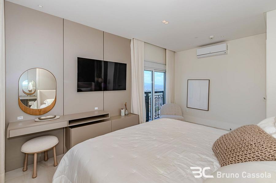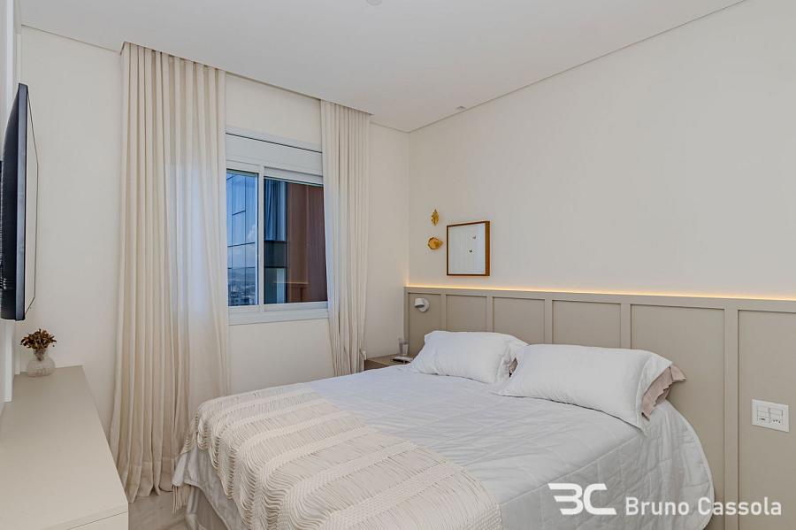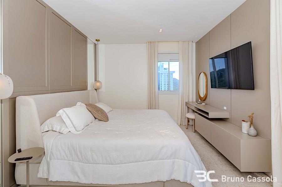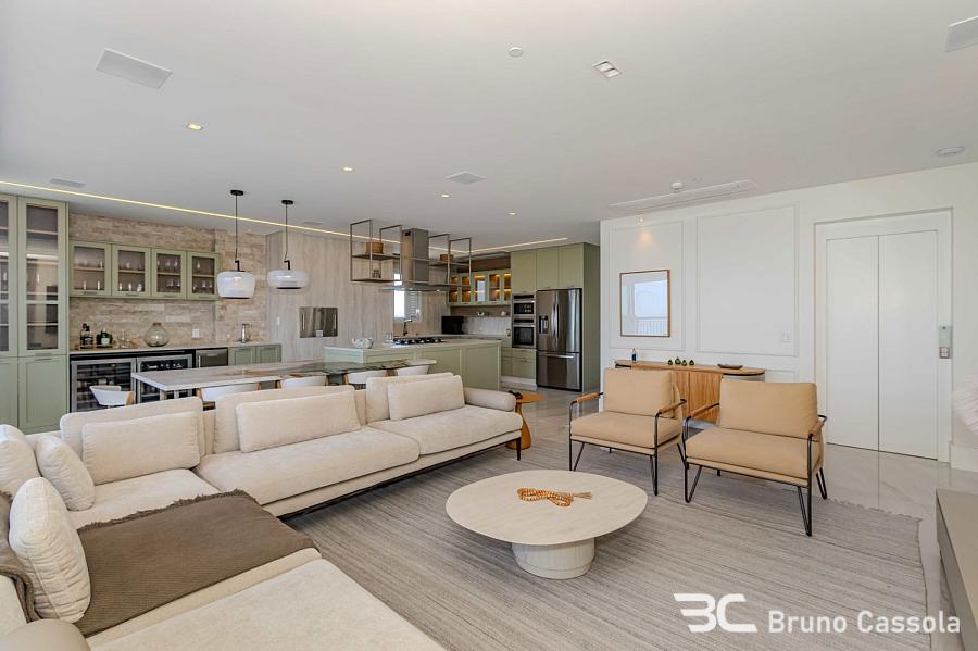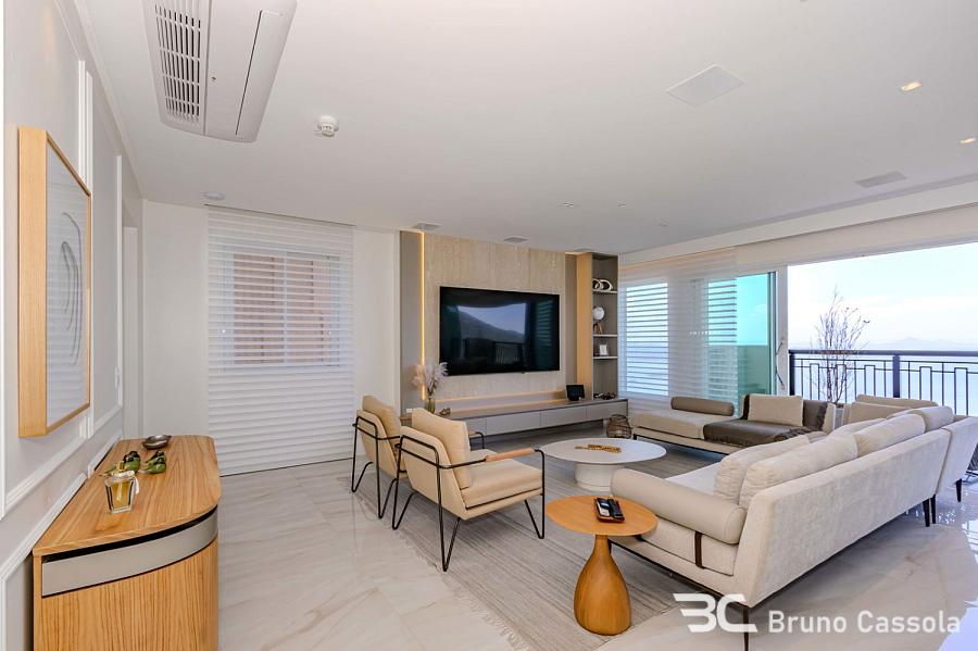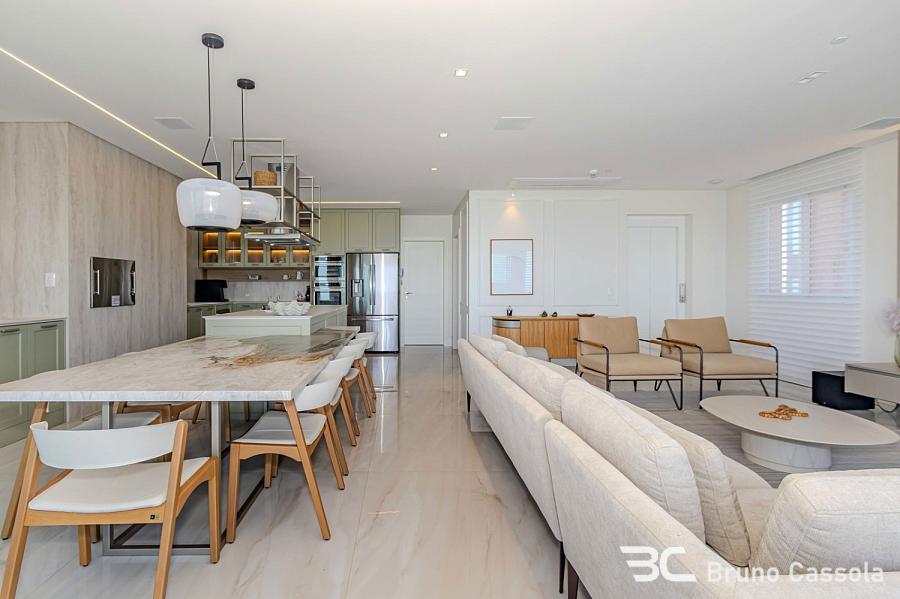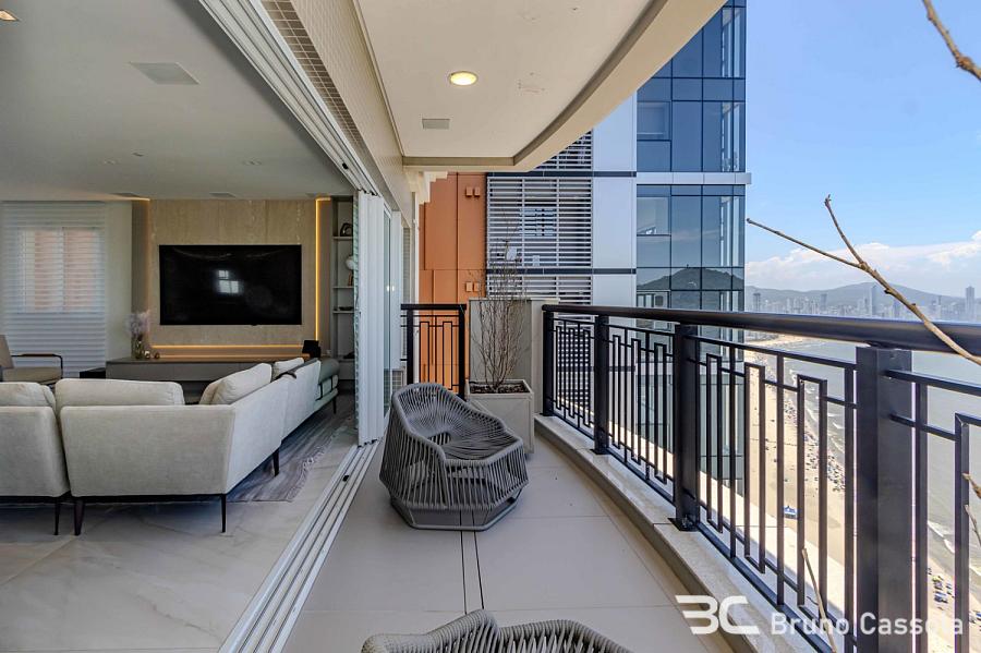 Apartamento à venda no Edifício Aurora, localizado na Barra Sul em Balneário Camboriú, Santa Catarina. O imóvel está situado em andar alto, possui vista frontal para o mar e apresenta o padrão construtivo da Embraed. A unidade conta com cinco suítes e é entregue totalmente mobiliada e decorada. A planta interna integra os ambientes sociais com a sacada, que é equipada com churrasqueira a carvão e oferece visão panorâmica da orla. O apartamento dispõe de vagas de garagem com amplas dimensões para manobra e armazenamento. O edifício oferece infraestrutura de lazer completa sob o conceito de home resort, incluindo piscinas, academias e espaços de convivência. A localização estratégica na Barra Sul garante acesso direto às principais vias de saída da cidade e proximidade com a infraestrutura náutica e comercial da região.