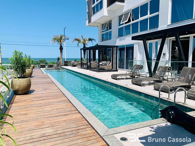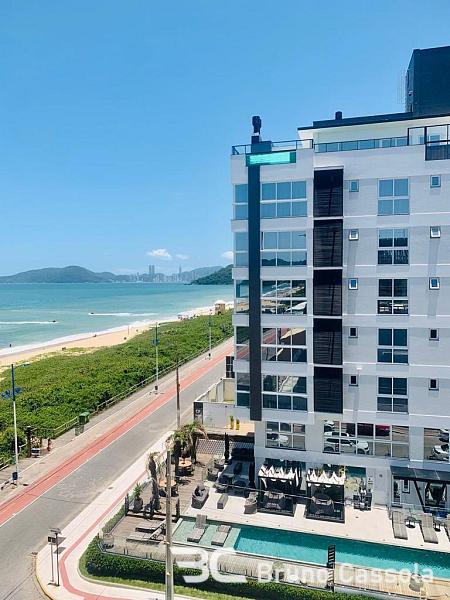Apartamento frente mar, mobiliado com 3 suítes, living integrado, espaço gourmet com churrasqueira e vista para toda a praia.