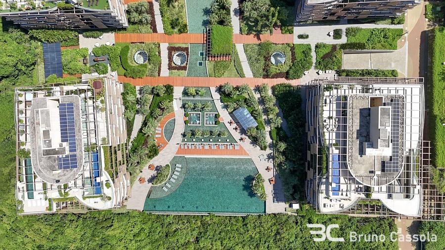 Infraestrutura de lazer estilo Resort com ambientes projetados para momentos em família, onde natureza e arquitetura se harmonizam. Mais de 1400 m² de piscinas salinizadas (tratamento que reduz o uso de produtos químicos, além de ser mais suave do que o cloro e não tóxico ao meio ambiente). Localização privilegiada de frente para o mar, na exclusiva e reservada Praia Brava Norte - Itajaí.