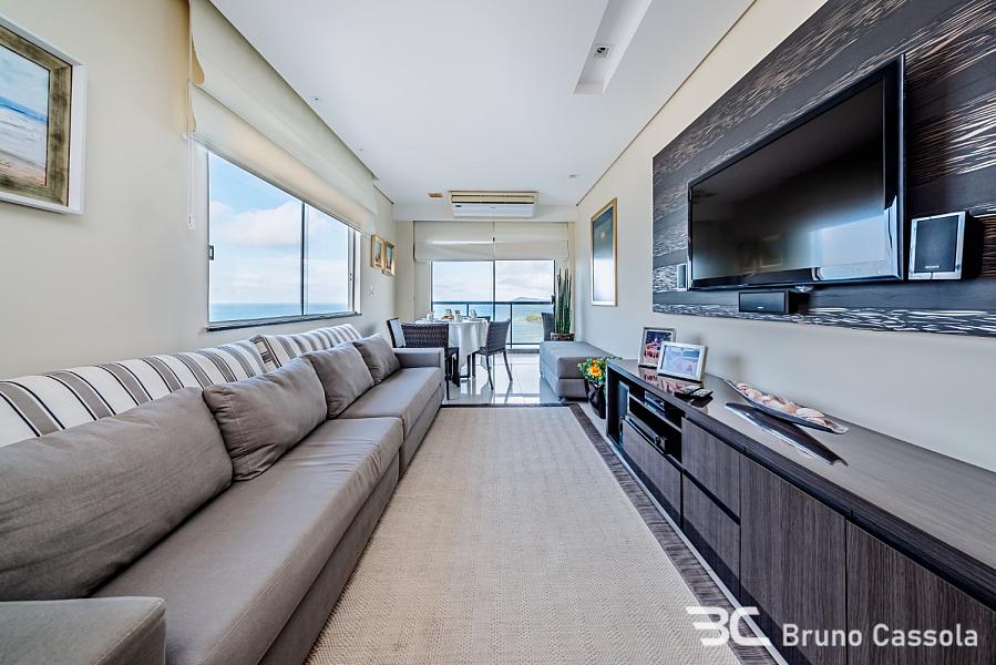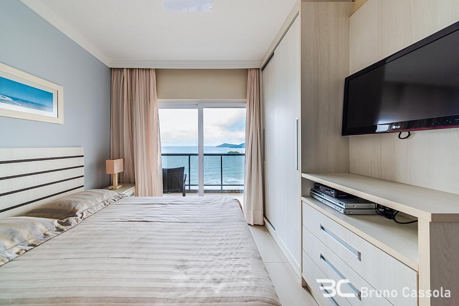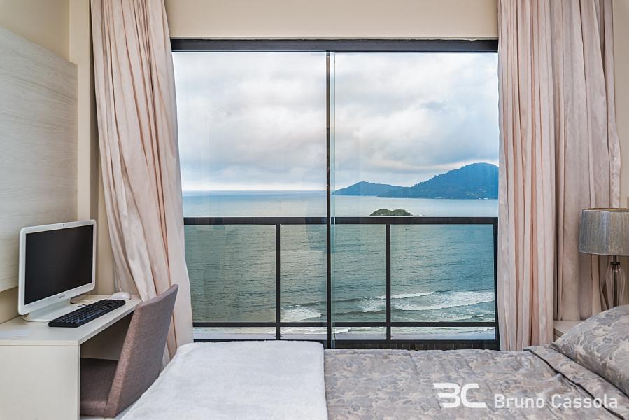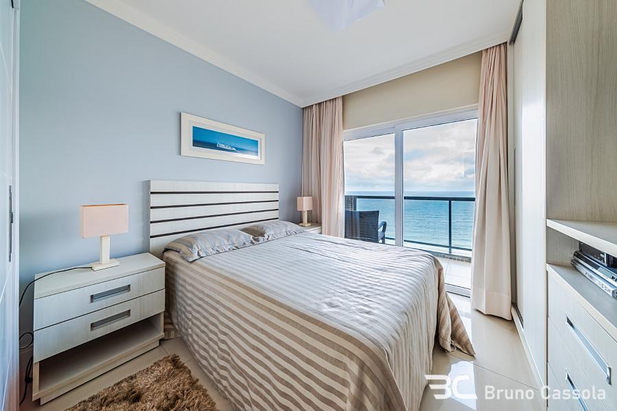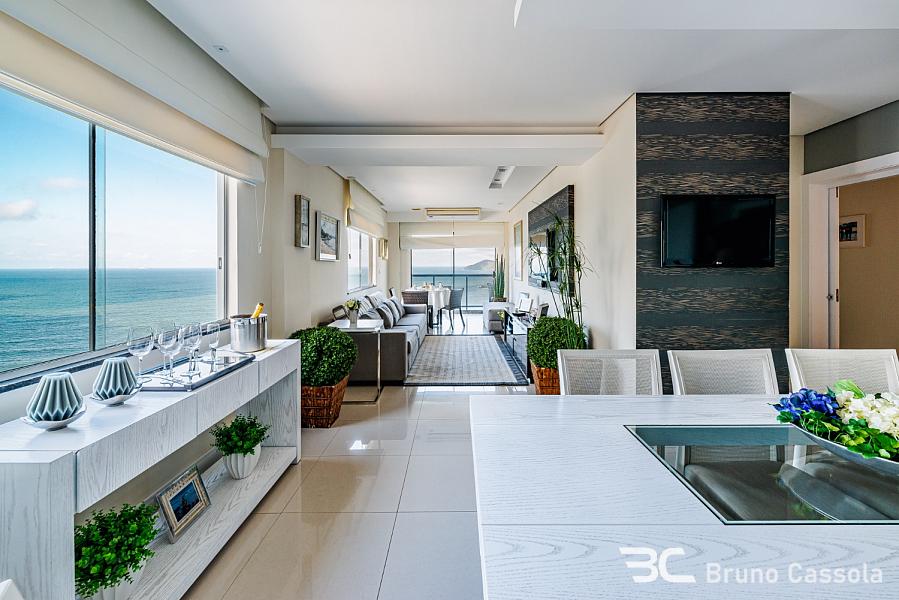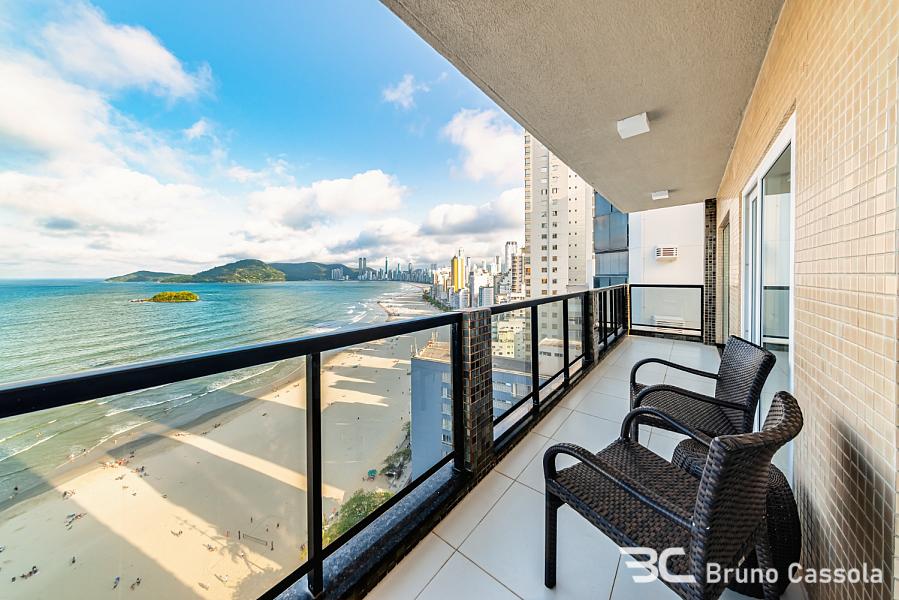 Apartamento frente mar, andar alto, 3 suítes sendo 2 frente mar com varanda, 138 m² privativos, ampla sacada externa com vista panorâmica para toda a praia. Living integrado com 3 ambientes, cozinha e área de serviço com dependência.