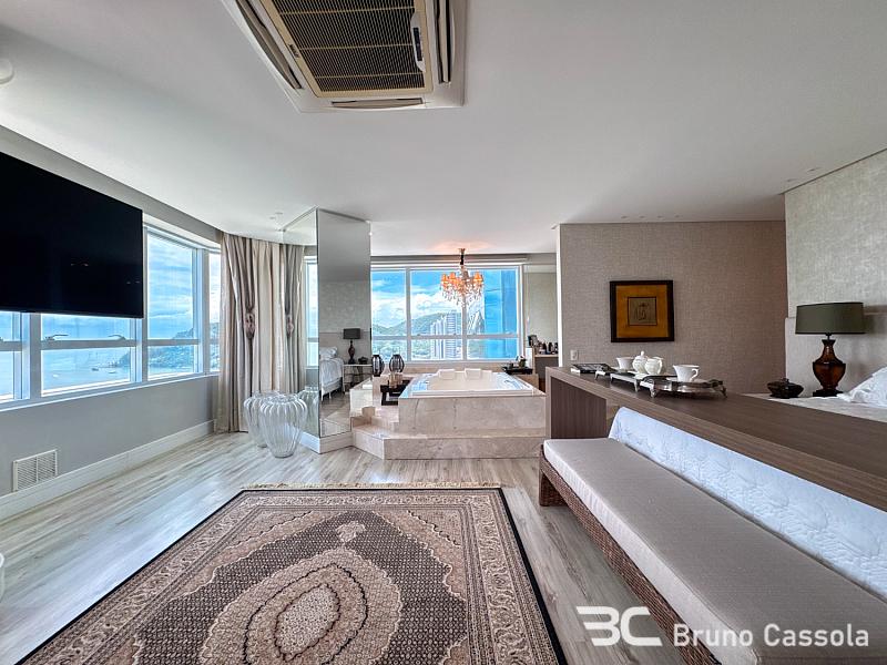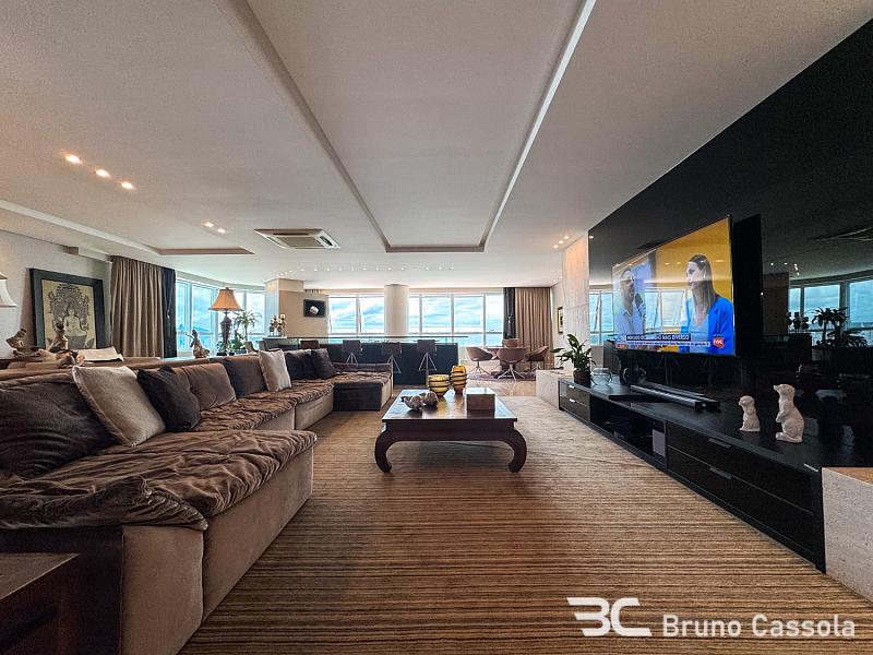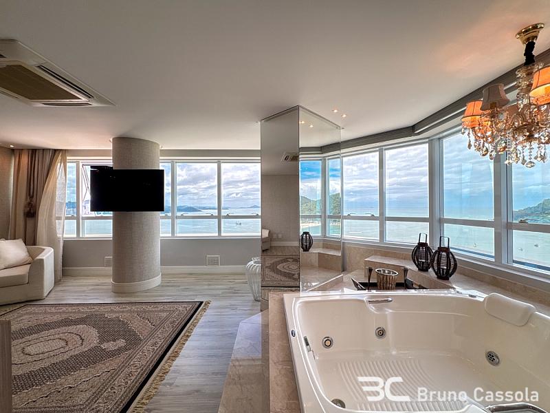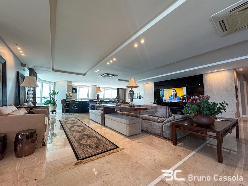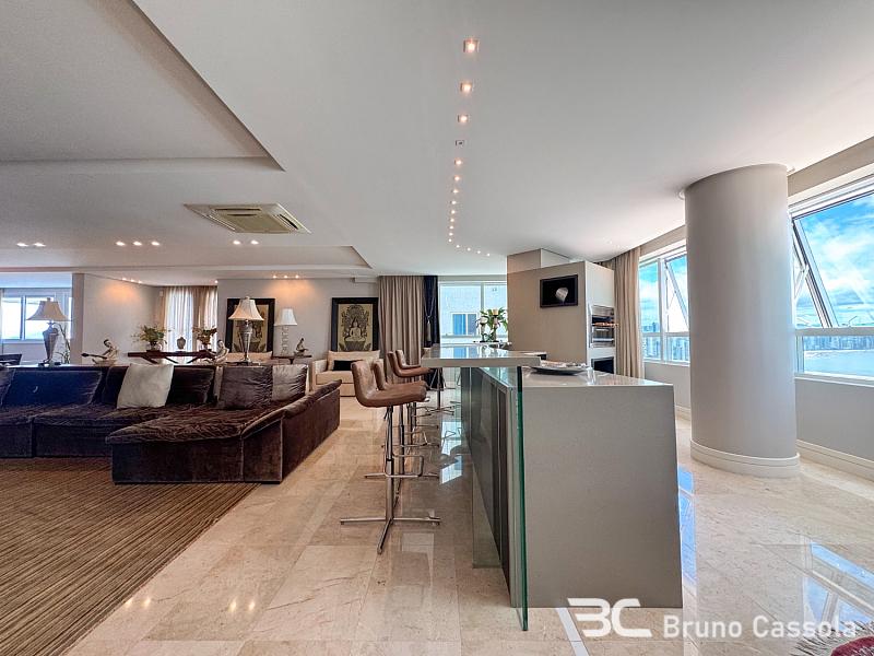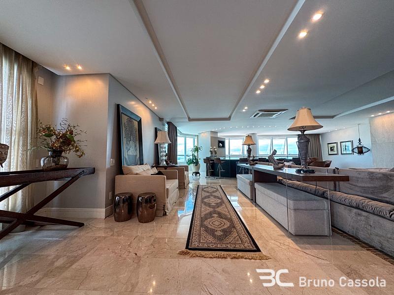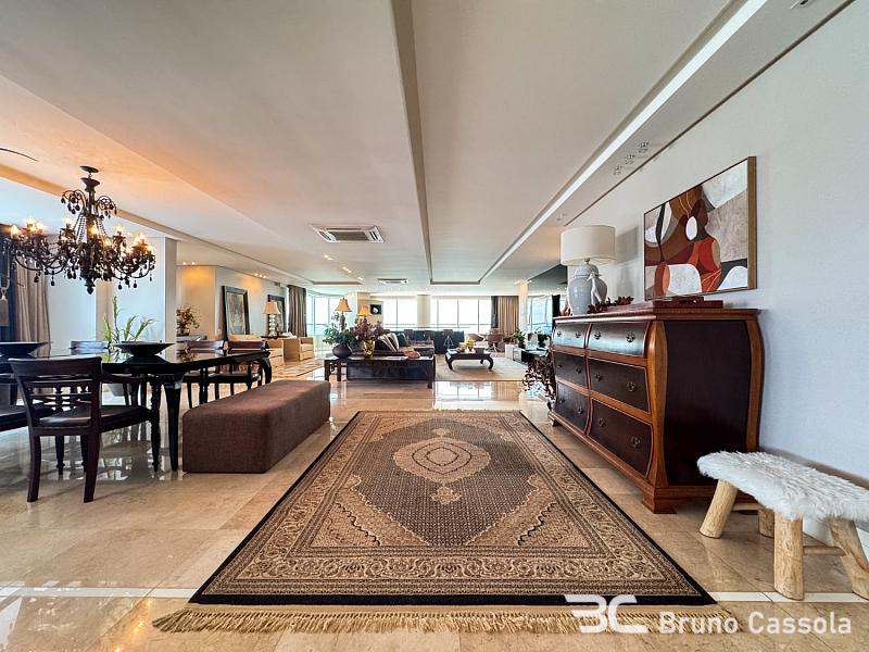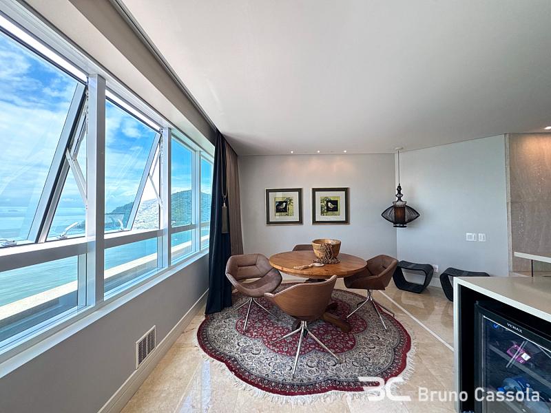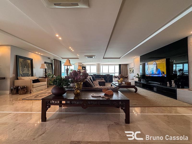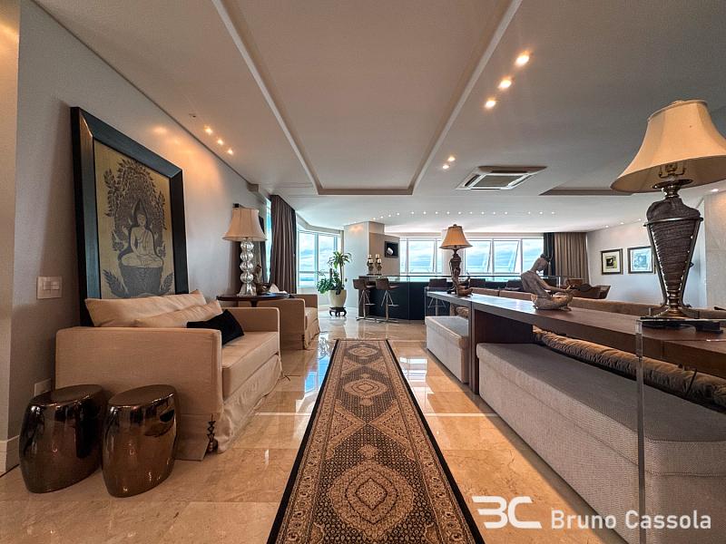 Este apartamento à venda está localizado no Edifício Costão da Barra, ocupando a torre central do empreendimento com a configuração de um apartamento por andar. A unidade possui cinco suítes e apresenta projeto de interiores com mobiliário e decoração completos em todos os ambientes. O imóvel dispõe de churrasqueira privativa e vista panorâmica para a orla marítima, favorecida pelo posicionamento geográfico e arquitetônico da torre.