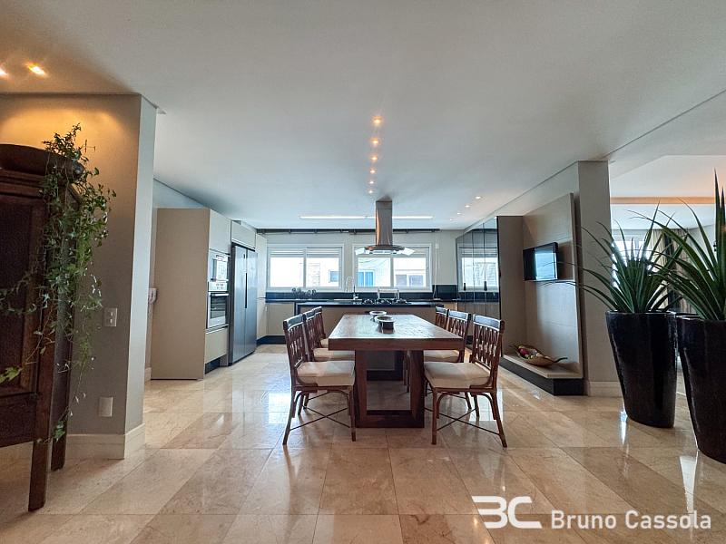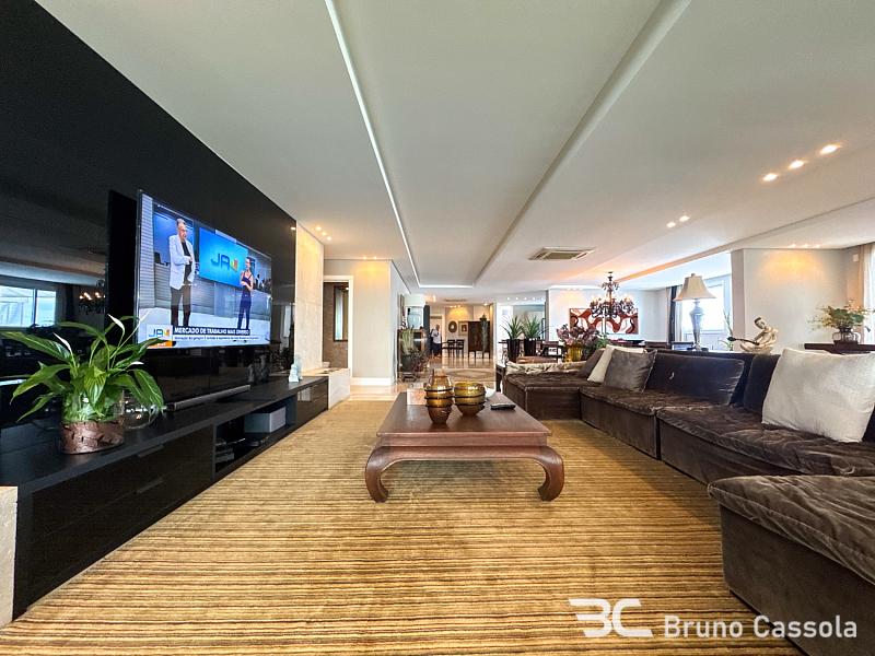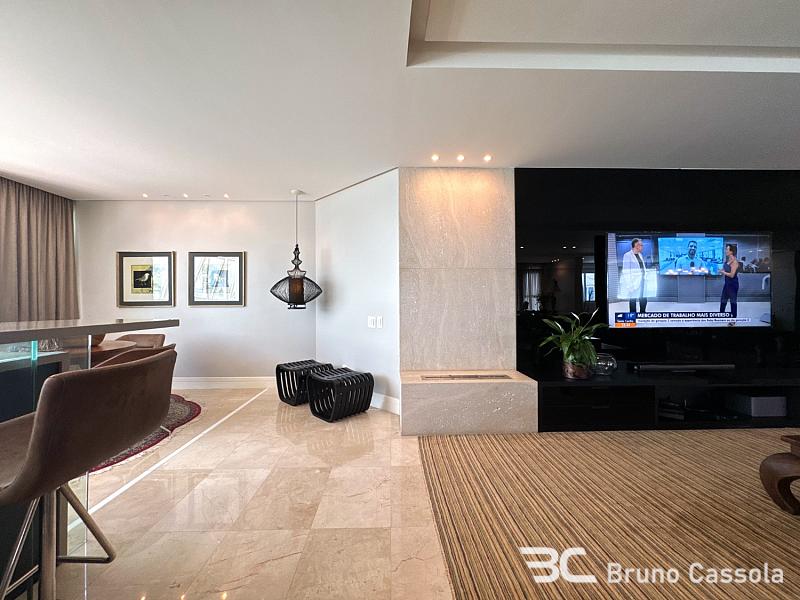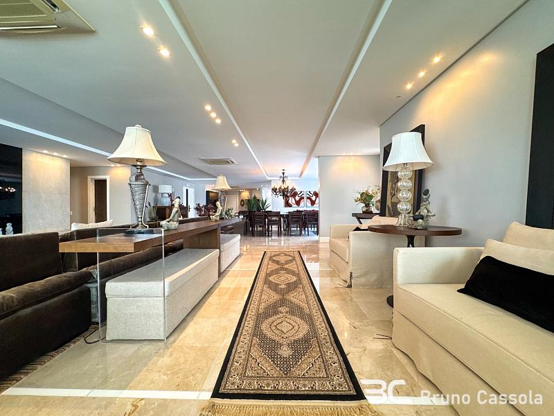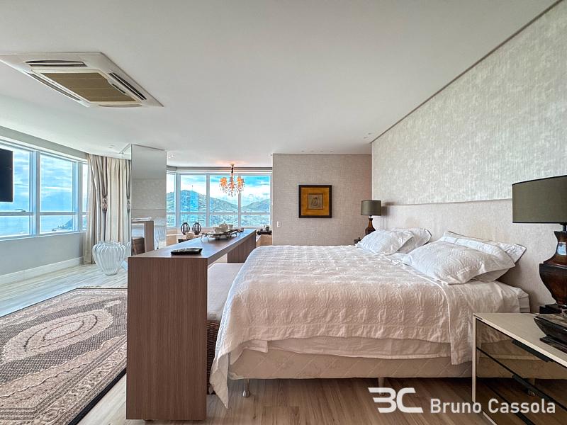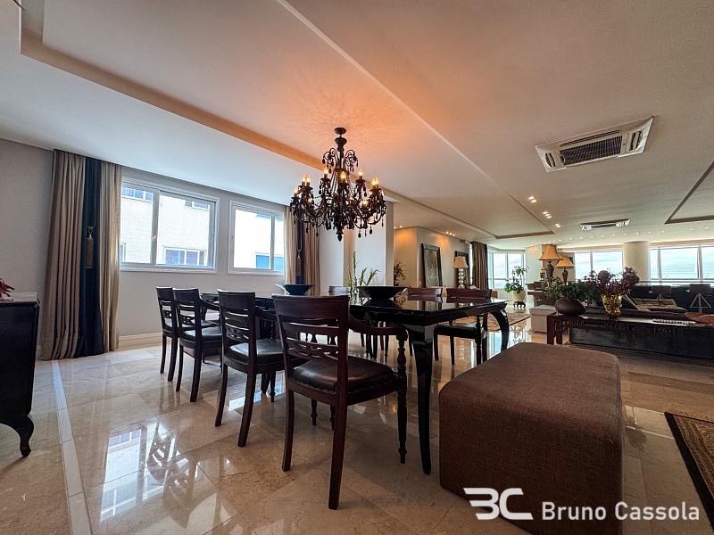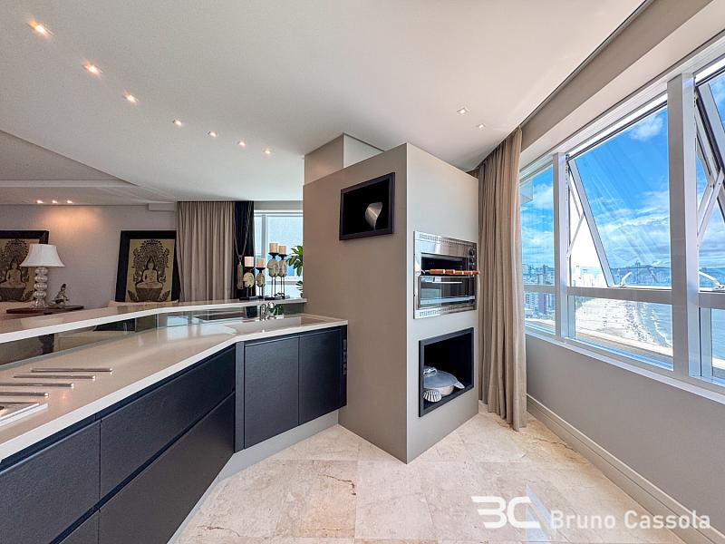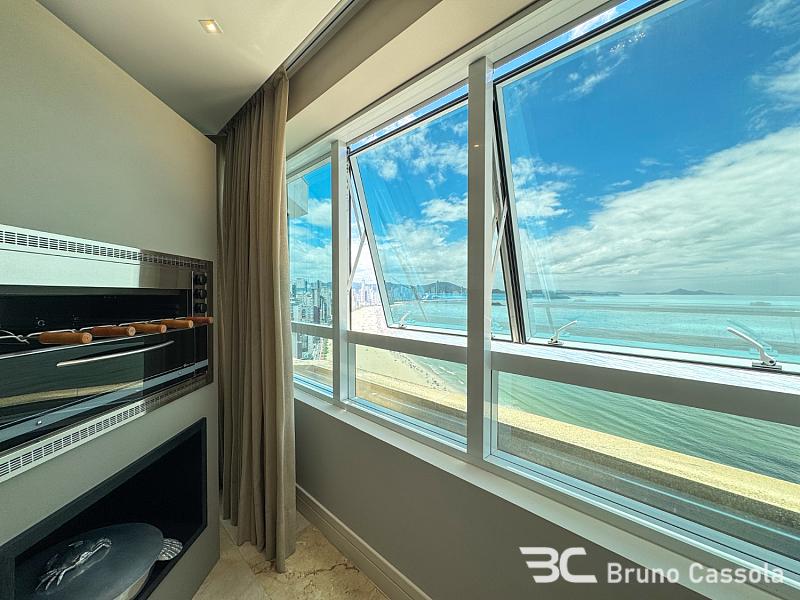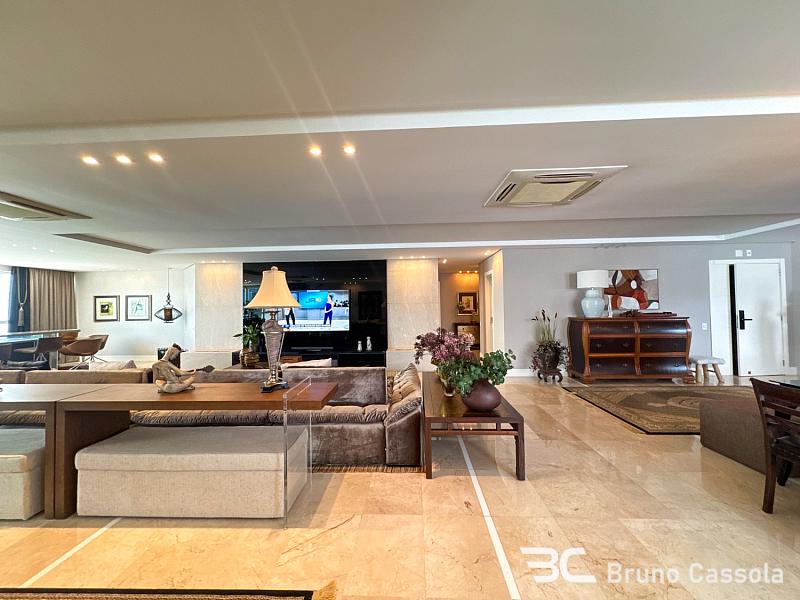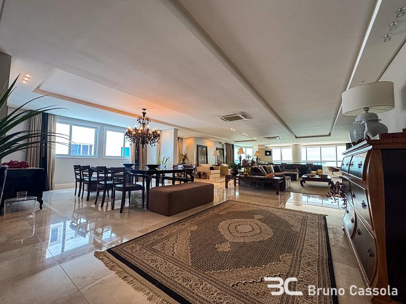 Este apartamento à venda está localizado no Edifício Costão da Barra, ocupando a torre central do empreendimento com a configuração de um apartamento por andar. A unidade possui cinco suítes e apresenta projeto de interiores com mobiliário e decoração completos em todos os ambientes. O imóvel dispõe de churrasqueira privativa e vista panorâmica para a orla marítima, favorecida pelo posicionamento geográfico e arquitetônico da torre.