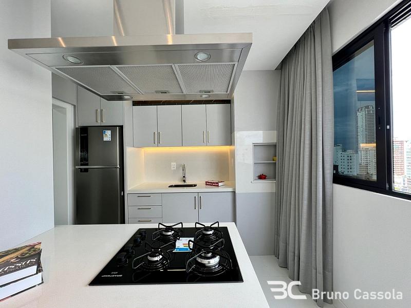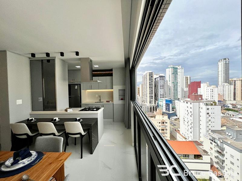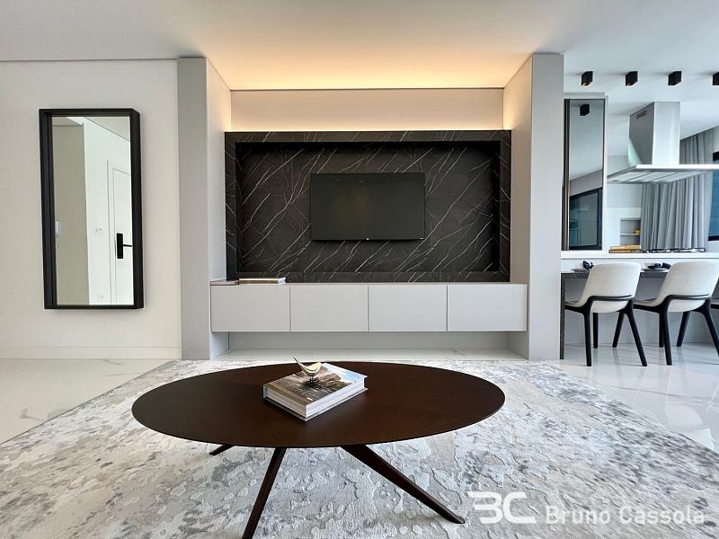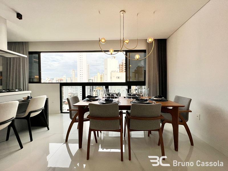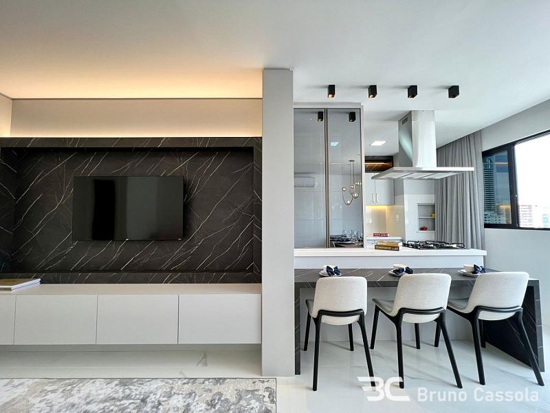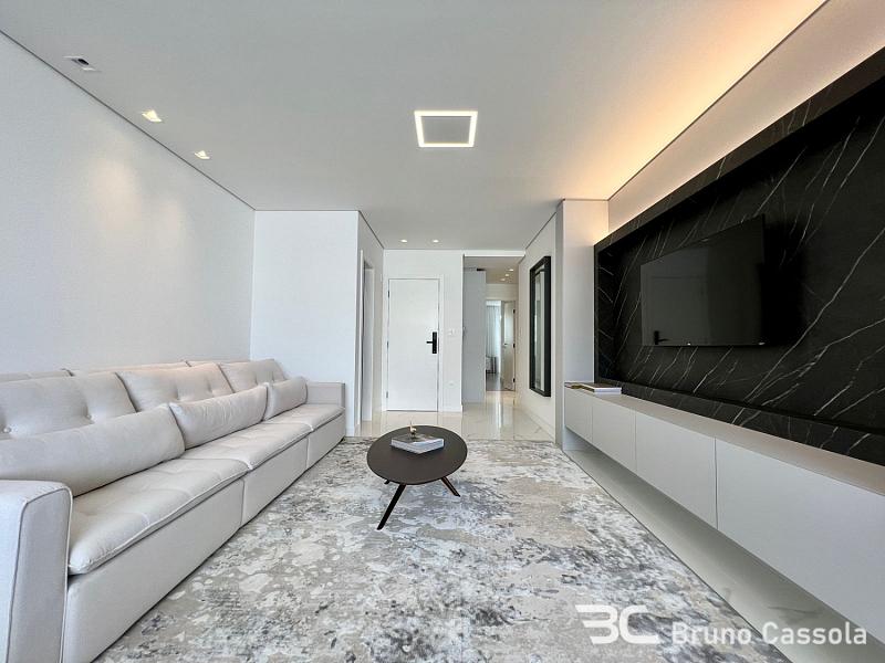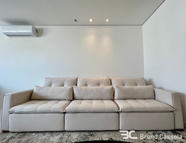 Apartamento novo, mobiliado e decorado, 3 suítes, 112 m² privativos, living integrado com sala de estar, jantar e espaço gourmet com churrasqueira à carvão, lavabo, área de serviço e 3 vagas de garagem. Acabamentos refinados com rebaixo de gesso e piso em porcelanato, pé direito alto e esquadrias com vidro do piso ao teto, proporcionando ótima iluminação e ventilação.
