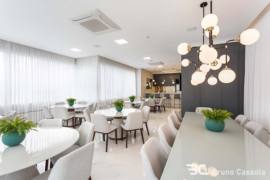 - Amplo living integrado com sala de estar, jantar, cozinha e espaço gourmet com churrasqueira
