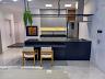 - Cozinha planejada com eletrodomésticos modernos e área de serviço funcional.