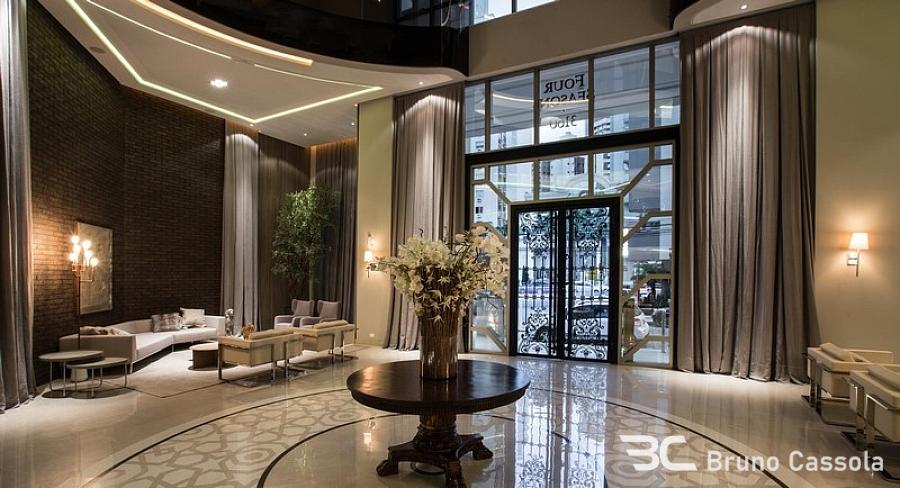 O Four Seasons possui uma identidade exclusiva - o magnífico Hall social com pé direito quíntuplo de 17 metros de altura, ornamentado com um lustre de cristal de 6 metros de comprimento, trazido de Dubai especialmente para este empreendimento.