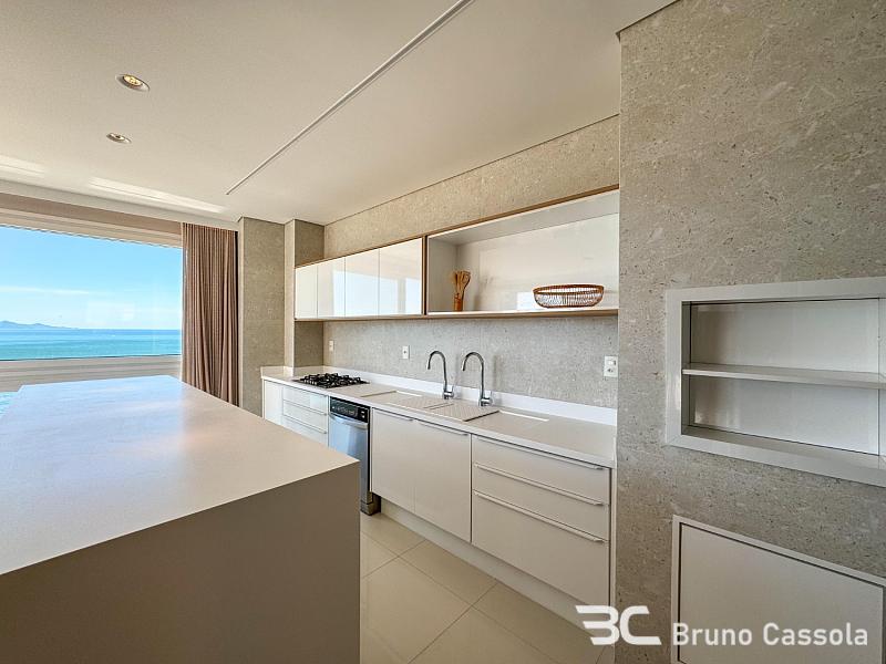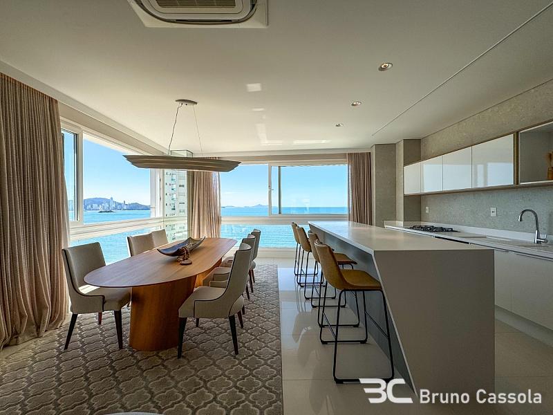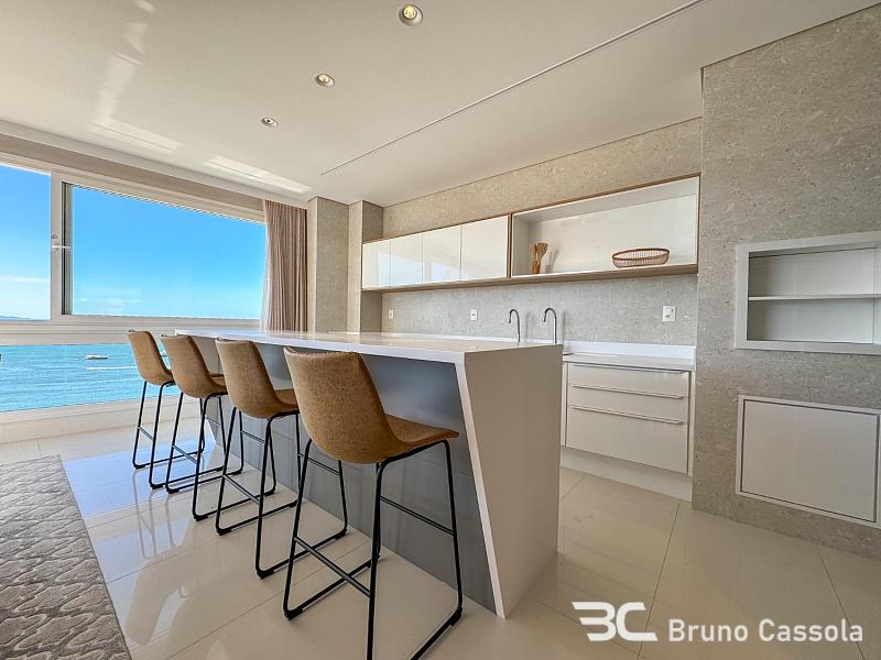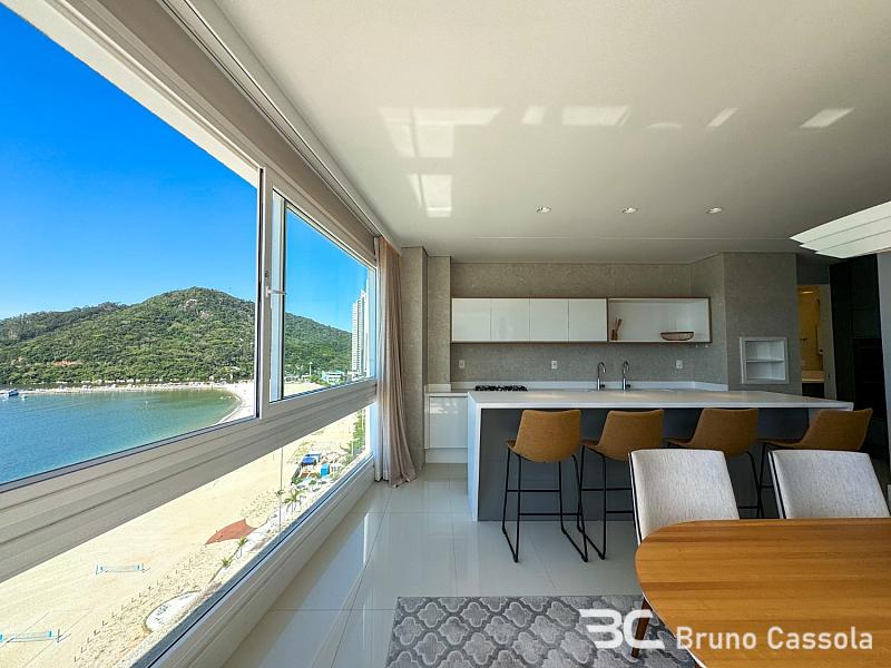 Apartamento frente mar finamente decorado com vista panorâmica para toda a praia, 3 suítes sendo uma master com infra para hidromassagem, 153 m² privativos, espaço gourmet com churrasqueira a carvão.