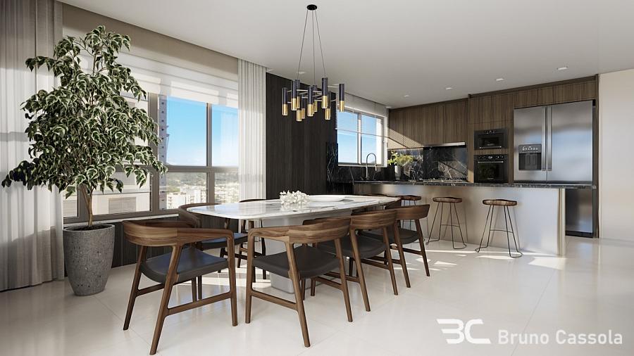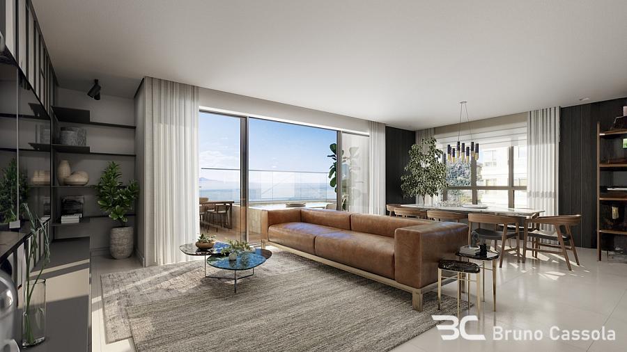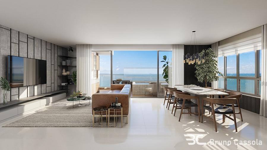 Apartamento com 232,15 m² privativos, living integrado com sala de estar, jantar e cozinha americana, 4 suítes sendo 1 master com closet e hidromassagem, 4 vagas, sacada com churrasqueira a carvão e vista panorâmica para o mar.