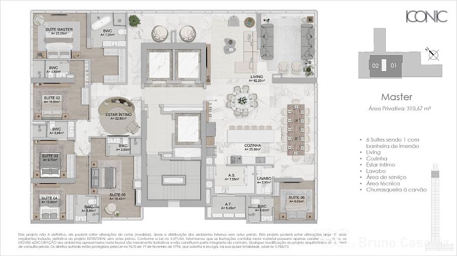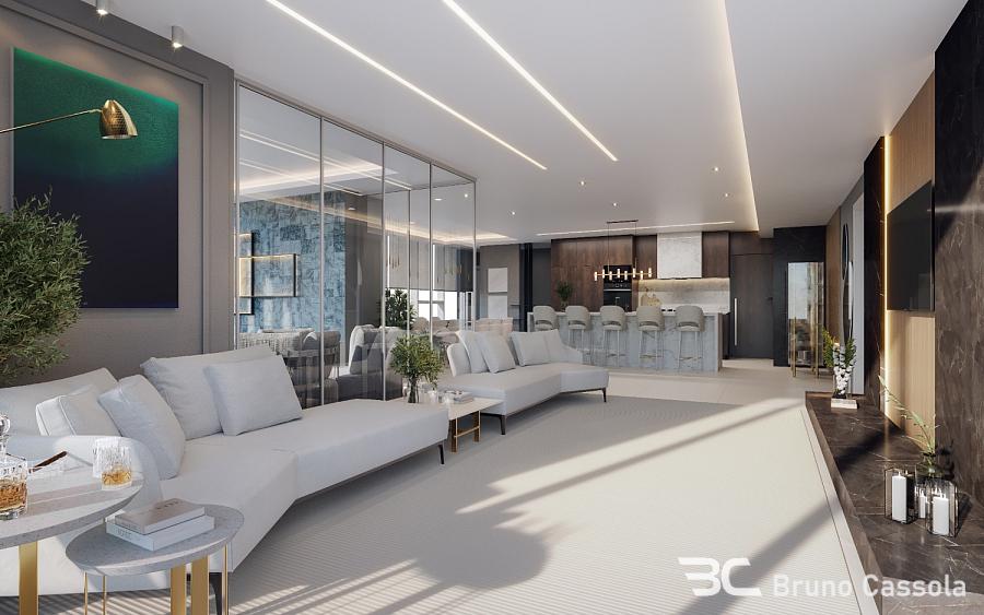 Apartamento MASTER em andar alto, apenas 1 unidade por andar, com 310 m² privativos, 6 suítes sendo uma master com banheira de imersão, living integrado, churrasqueira a carvão, 4 vagas de garagem.