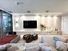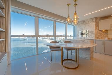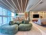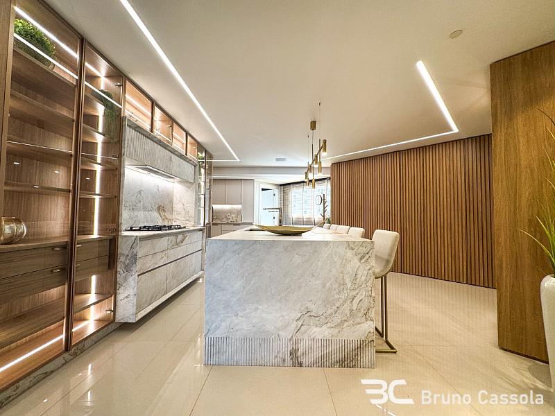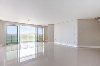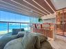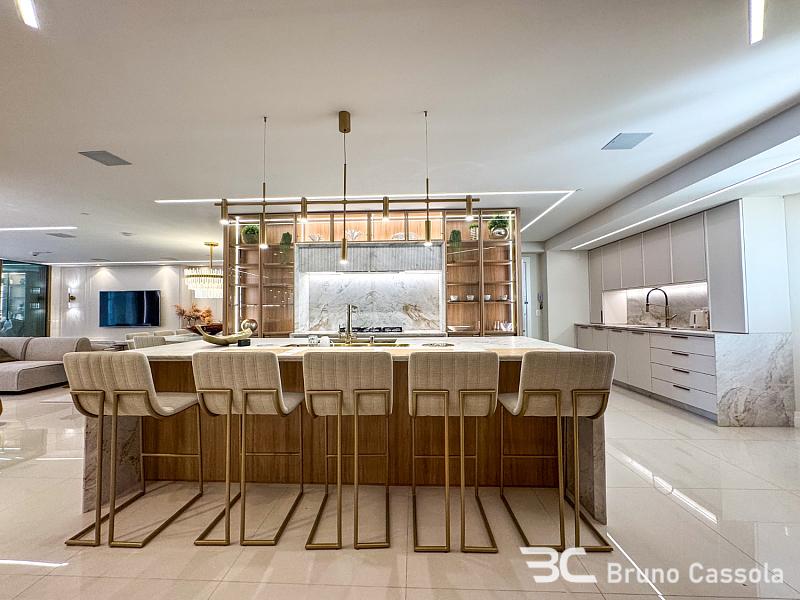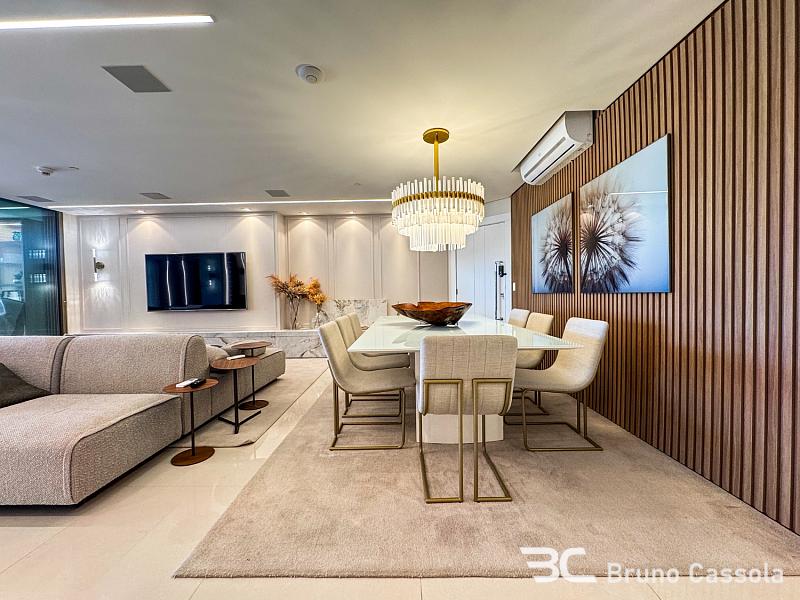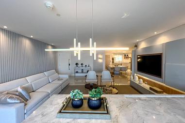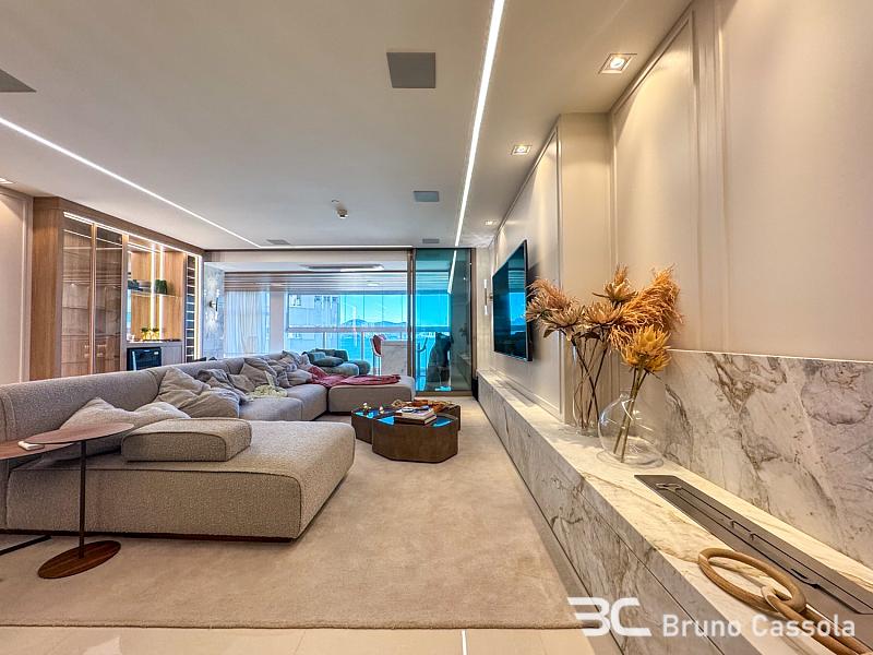 A área social é generosa e integrada, com ambientes amplos e iluminados que se conectam à varanda com vista permanente para o mar. A decoração contemporânea, aliada a um projeto de interiores sofisticado, cria uma atmosfera acolhedora e ao mesmo tempo imponente.