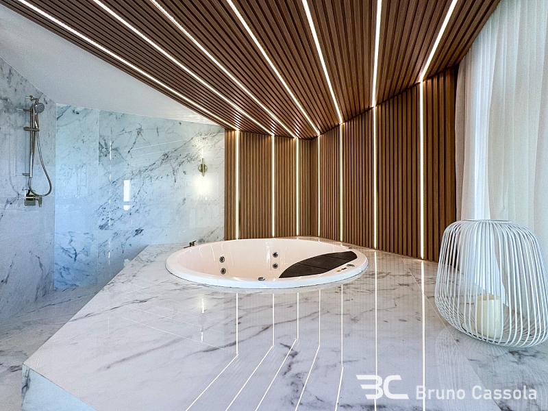 Com 250 metros quadrados de área privativa, o imóvel conta com quatro suítes amplas, muito bem distribuídas e decoradas com extremo bom gosto. Cada detalhe foi cuidadosamente pensado para proporcionar elegância e funcionalidade. A suíte master se destaca com uma jacuzzi privativa posicionada estrategicamente para aproveitar a vista panorâmica do oceano, criando um verdadeiro refúgio dentro de casa.