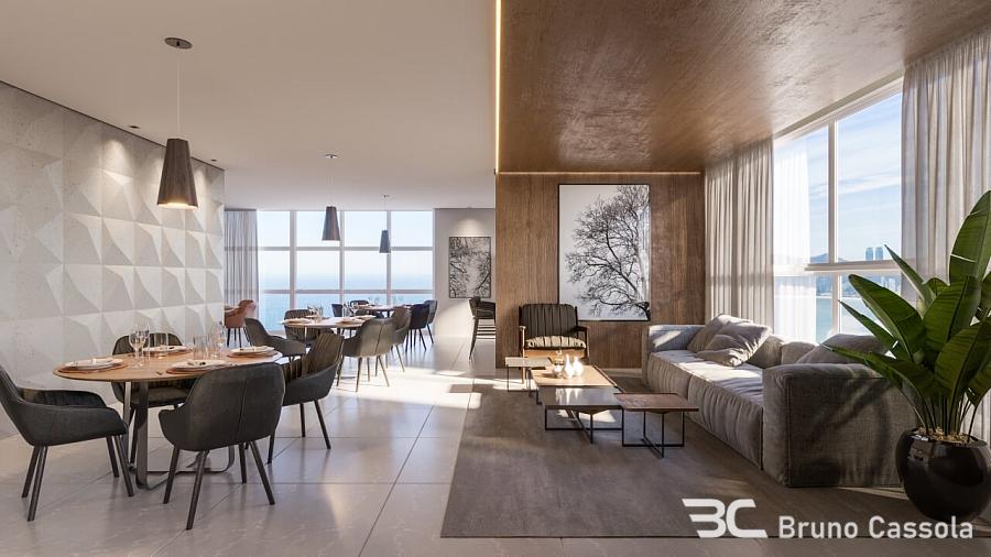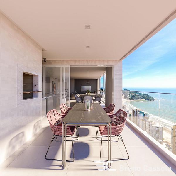 Apartamento com 181 m² privativos, 4 suítes, amplo living integrado, sacada com churrasqueira a carvão e vista para o mar.