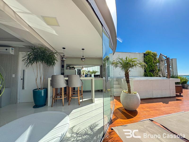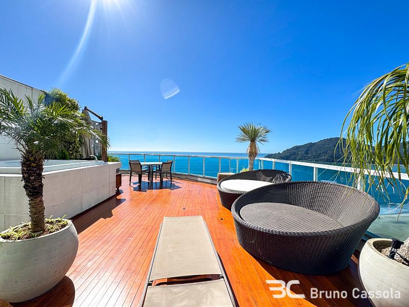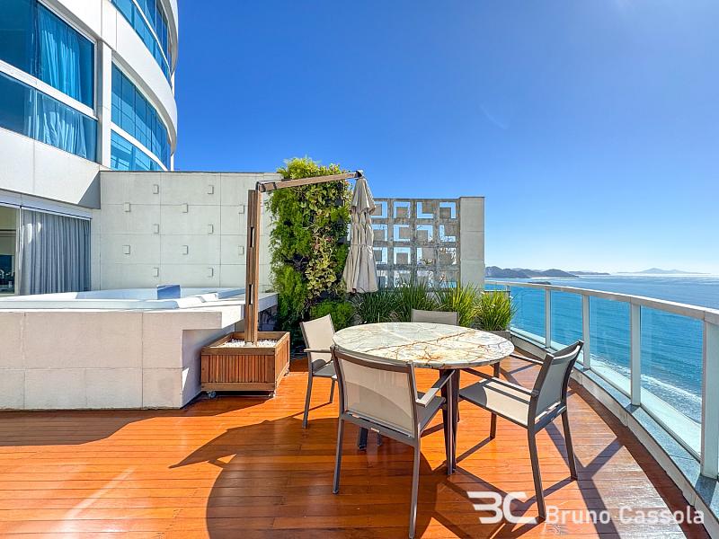 À venda no Edifício Number One, Avenida Atlântica, Balneário Camboriú: apartamento acima do 19º andar, frente mar, com 220 m² de área privativa e 3 quartos. Destaca-se por sua área externa exclusiva com terraço e jacuzzi privativa, oferecendo vista panorâmica para o mar. Inclui 2 vagas de garagem e o condomínio dispõe de área de lazer.