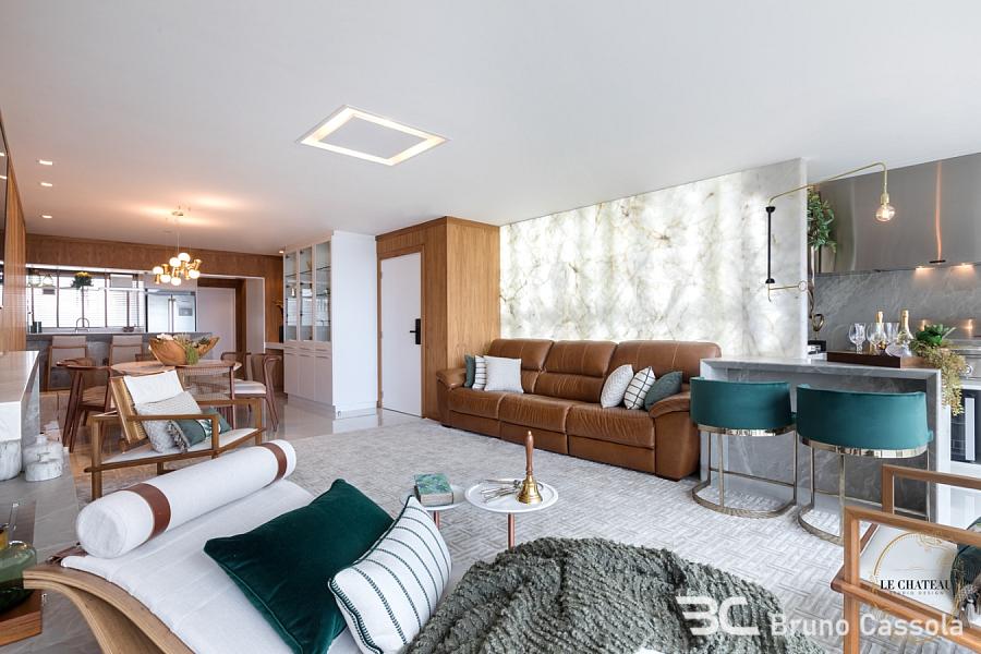 Apartamento finamente decorado com 196 m² privativos, 4 suítes sendo 1 master com hidromassagem, living integrado com sala de estar, jantar, cozinha e espaço gourmet com churrasqueira, dependência de serviço, 3 vagas de garagem.