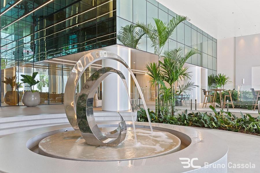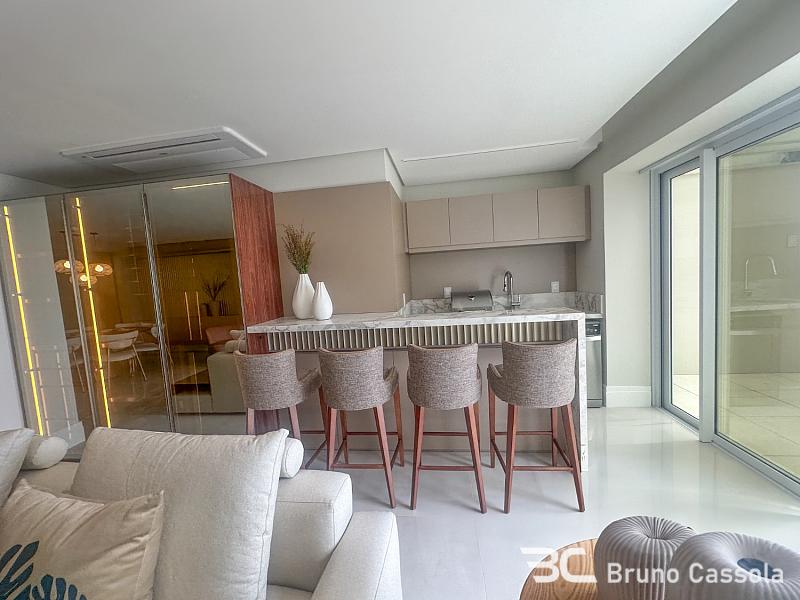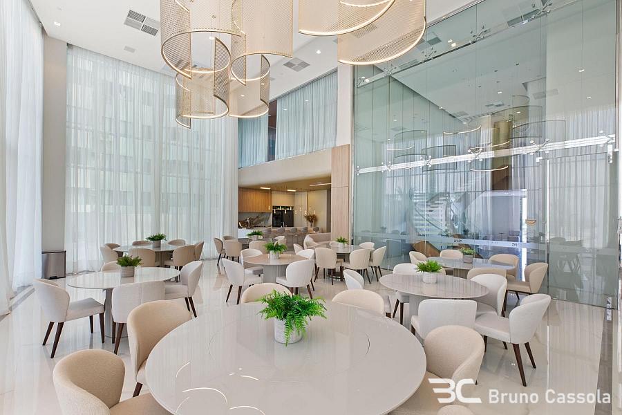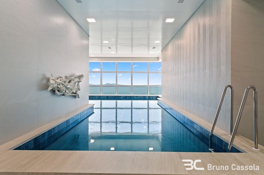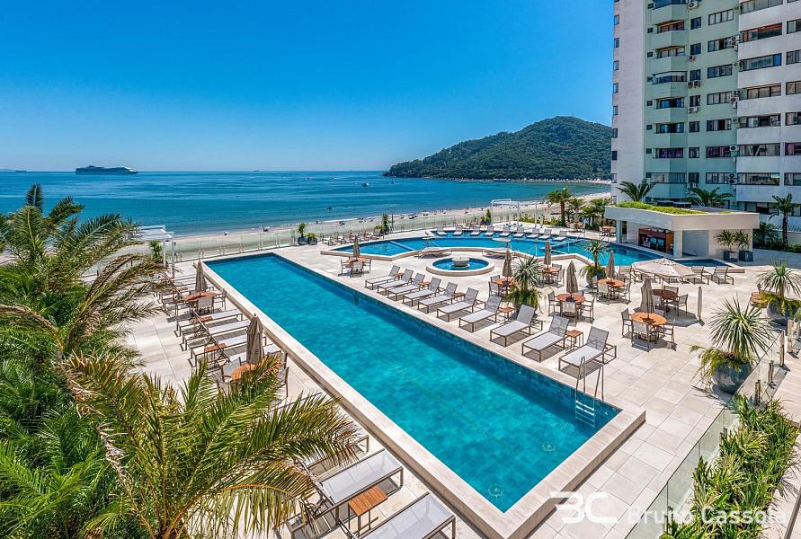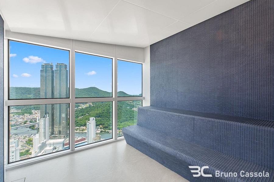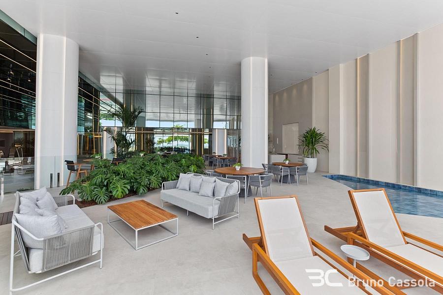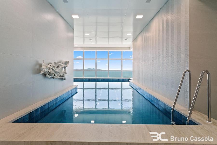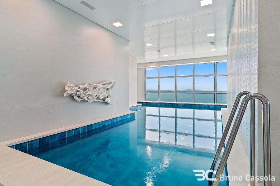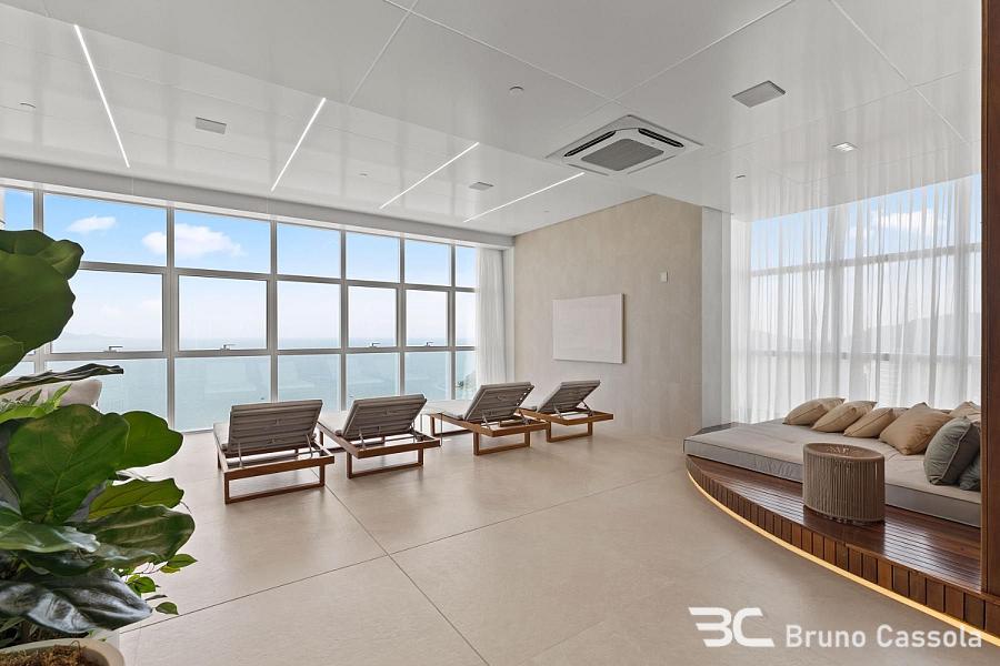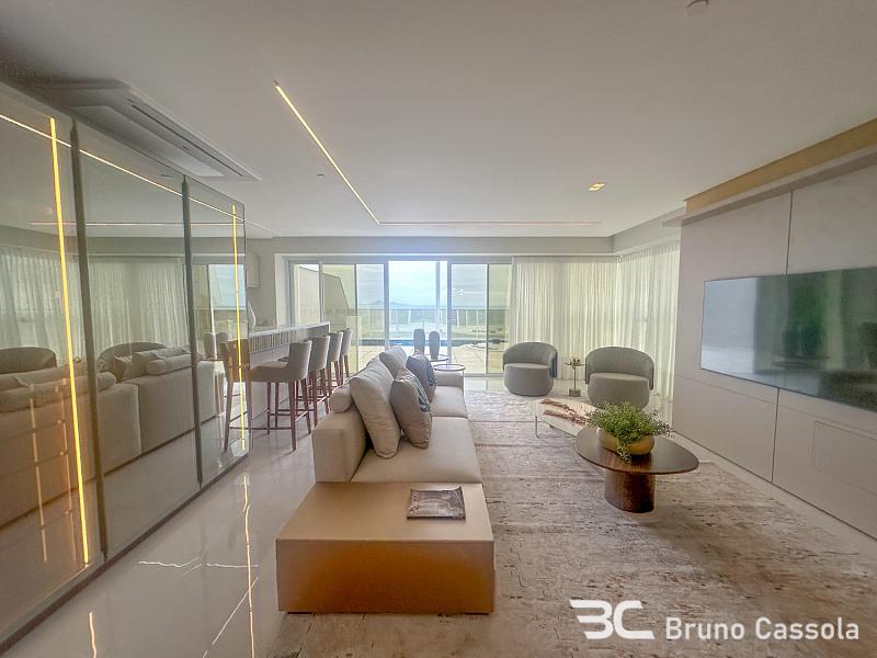 Apartamento com 360 m² privativos, 4 suítes sendo 1 master com hidromassagem, 1 suíte de serviço, 5 vagas de garagem, living integrado com sala de estar, jantar e espaço grill e uma vista deslumbrante para o mar. Imóvel amplo, com fachada em pele de vidro unificada, favorecendo a vista panorâmica e a incidência de luz natural.