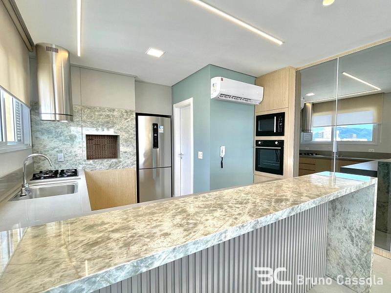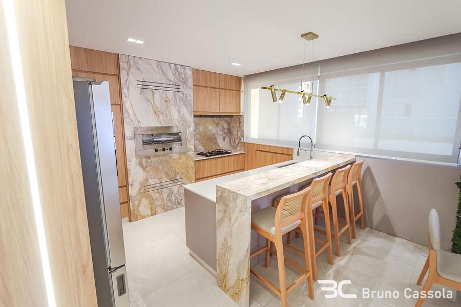A cozinha é moderna e funcional, complementada por um lavabo, churrasqueira a carvão e uma área de serviço. O apartamento conta ainda com 02 vagas de garagem e um box de praia.