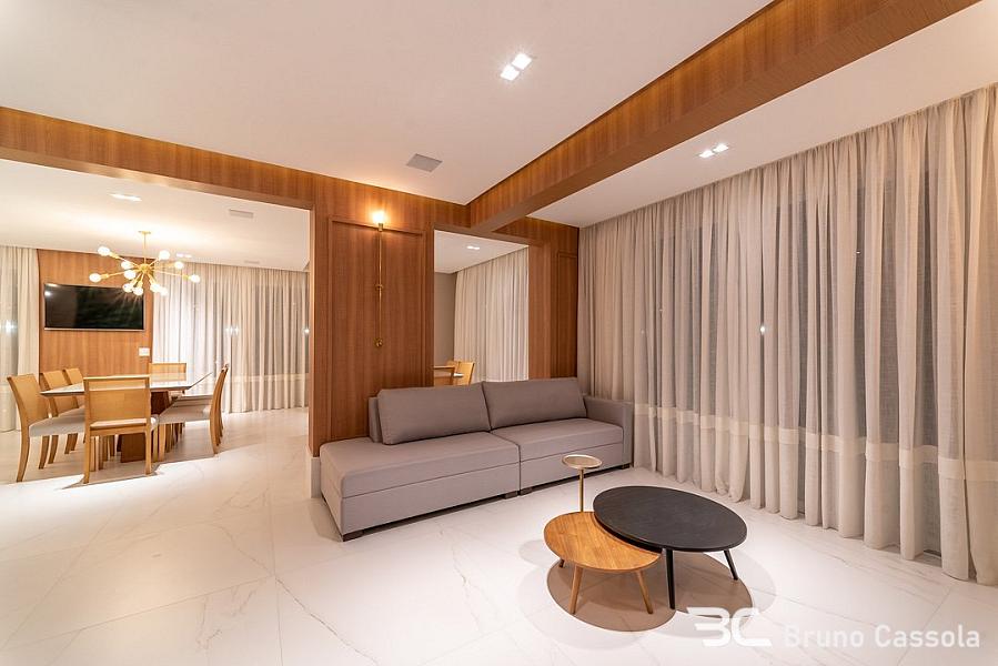 Apartamento andar alto, mobiliado e decorado com 179 m² privativos, planta espaçosa e funcional, 3 suítes, amplo living integrado, sala de estar com varanda e espaço gourmet com churrasqueira.