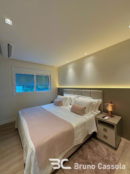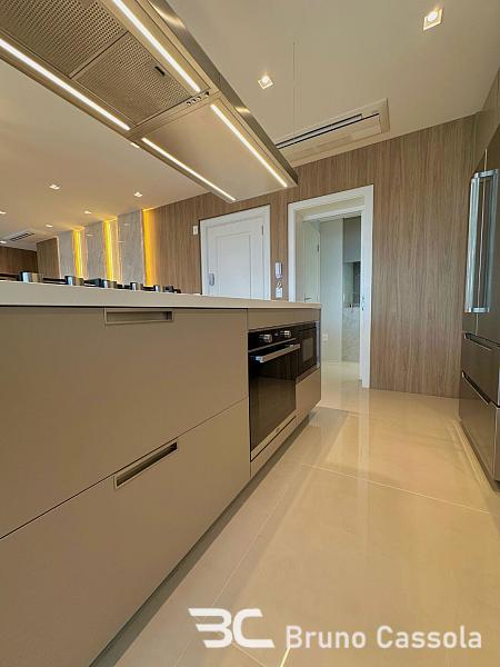 A planta interna é composta por quatro suítes independentes e área social integrada, que contempla living para múltiplos ambientes e cozinha equipada. O acabamento inclui pisos em grandes formatos, rebaixamento em gesso, climatização instalada e automação residencial. A mobília e os itens de decoração acompanham a unidade conforme a configuração atual de exposição.