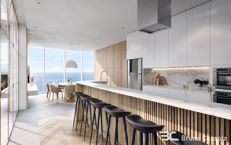 Apartamento com 146 m² privativos, vista definitiva para o mar e 4 dormitórios, sendo 2 suítes e 2 demi-suítes.