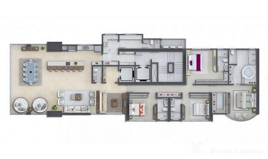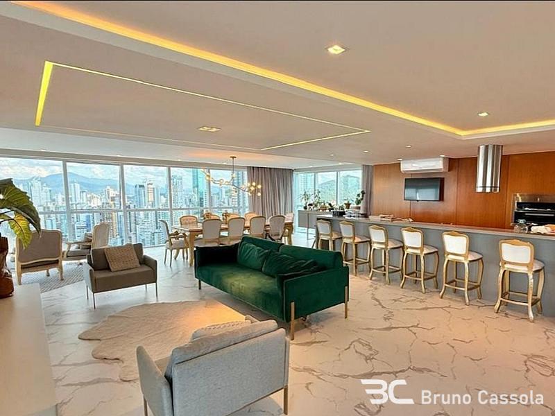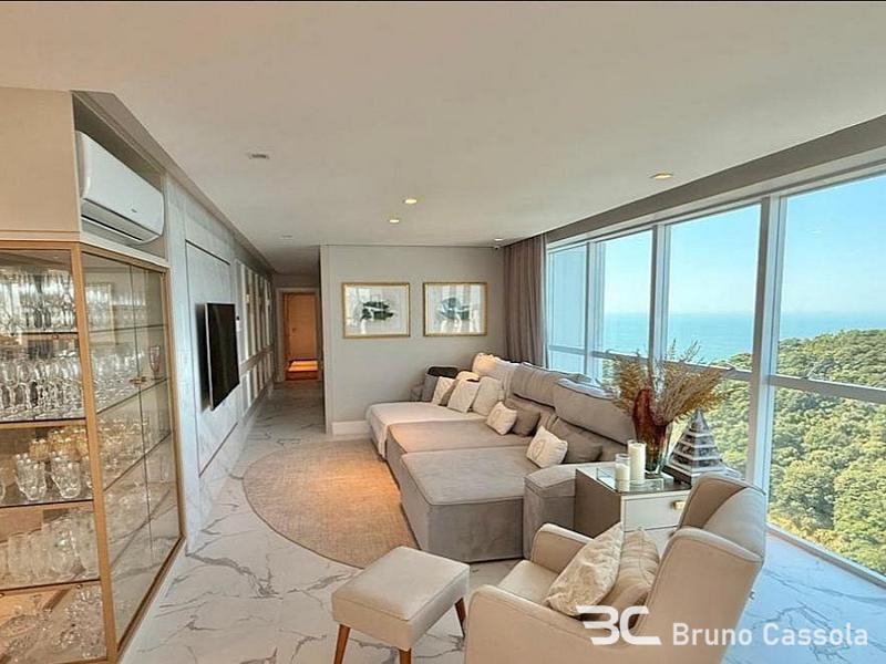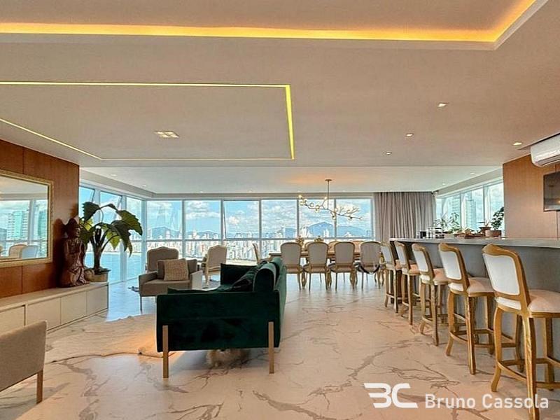 Apartamento frente mar com 282 m² privativos, 4 suítes, amplo living integrado com mais de 160 m², composto por sala de estar, sala de jantar com mesa para 10 pessoas, cozinha americana e espaço gourmet com churrasqueira.