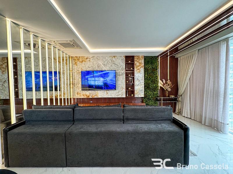 Apartamento com 150 m² privativos, 04 suítes, living integrado com vista para o mar, sala de estar, sala de jantar e cozinha americana,03 vagas de garagem, andar alto.