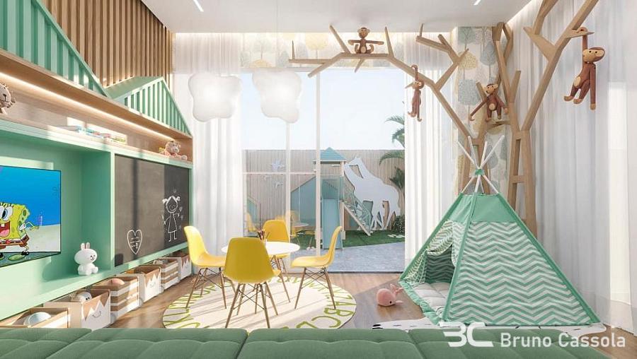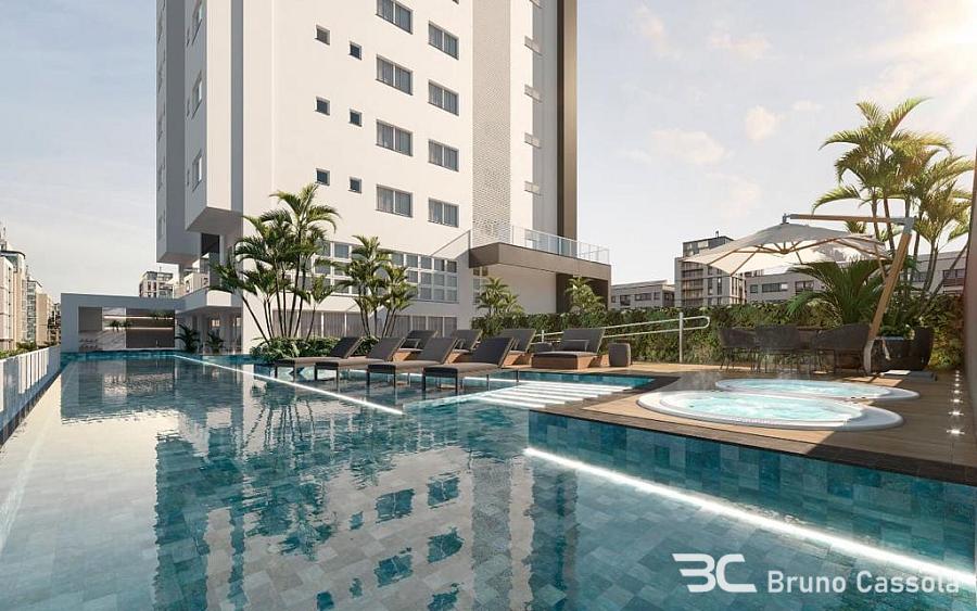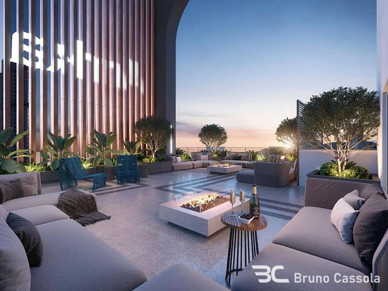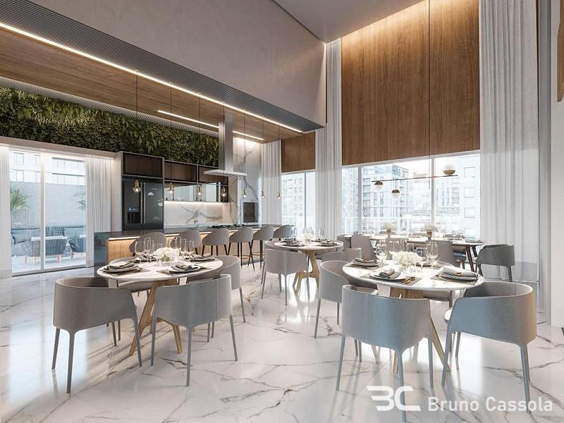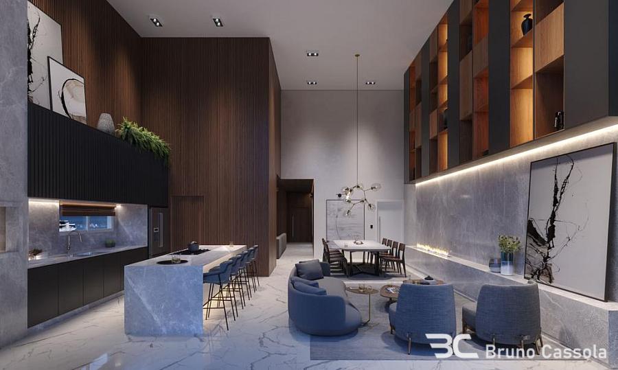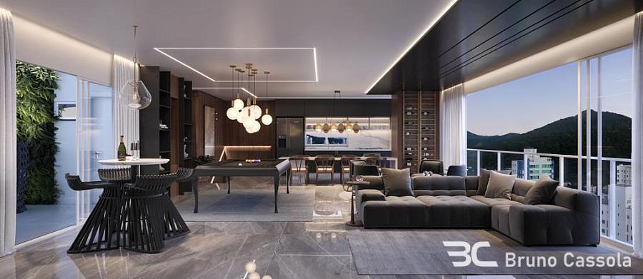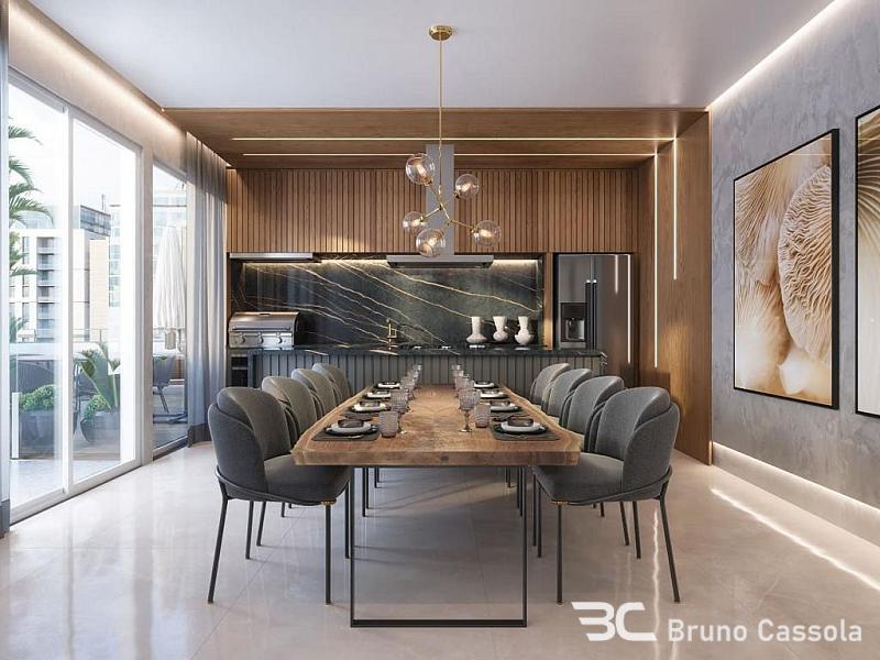 Apartamento de alto padrão com 143 m² privativos, 4 suítes, amplo living integrado com 50 m², sala de estar, sala de jantar, cozinha gourmet com churrasqueira a carvão, 3 vagas de garagem.