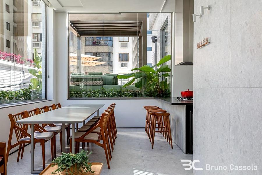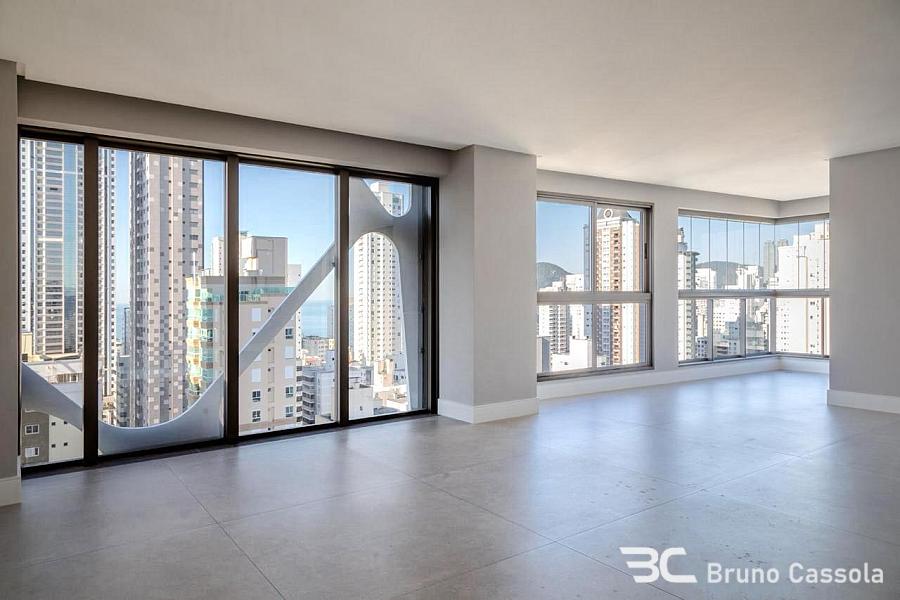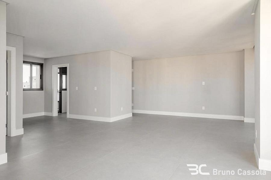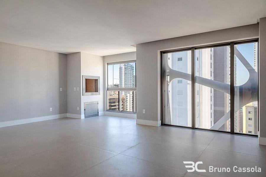 Apartamento novo com 122 m² privativos, 3 suítes, living integrado com sala de estar, jantar e espaço gourmet com churrasqueira a carvão, 3 vagas de garagem.