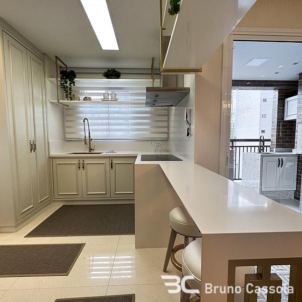 - Living integrado com sala de estar, jantar e cozinha americana