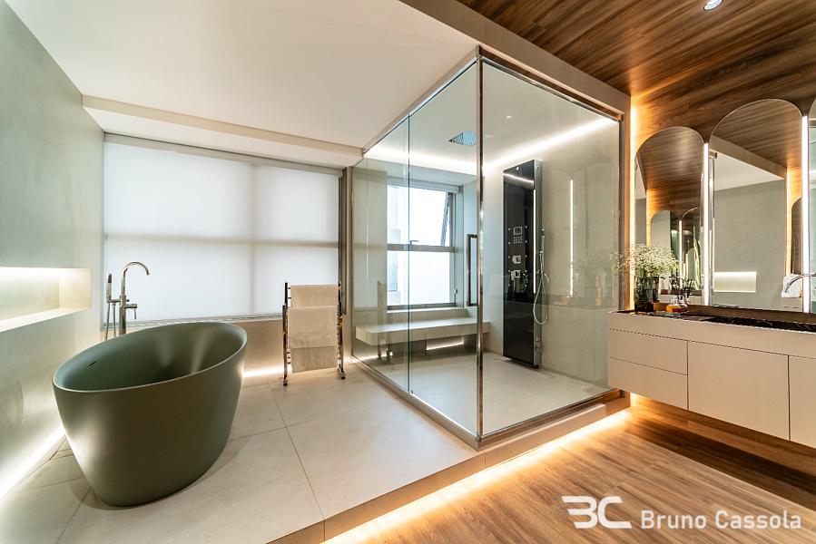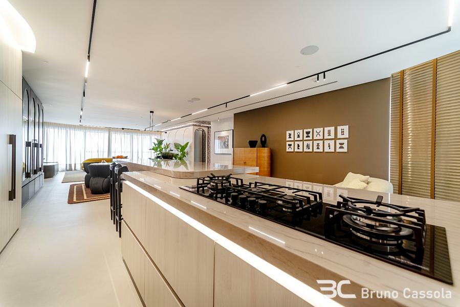 O apartamemnto com abientes amplos e integrados, a planta do Yachthouse em Balneário Camboriú proporciona uma excelente distribuição dos ambientes nos 265 m² de área privativa, incluindo uma suíte master com hidromassagem, um amplo living integrado para estar, jantar e uma cozinha semiaberta, além de um espaço gourmet com churrasqueira grill, lavabo e dependência completa. O apartamento no Yachthouse em Balneário Camboriú possui piso em porcelanato indiano nas áreas comuns e vinílico nos ambientes íntimos. As Portas Trada, eleitas as melhores do país, oferecem isolamento acústico e são confeccionadas em madeira maciça laqueada. A infraestrutura inclui aspiração central, automação e aquecimento nos pisos dos banheiros.