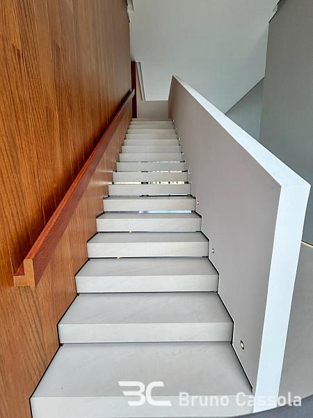 A fachada imponente, com concreto e brises amadeirados, anuncia o estilo moderno e elegante que define cada detalhe do imóvel.