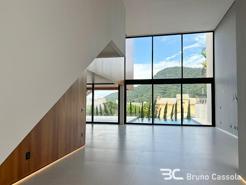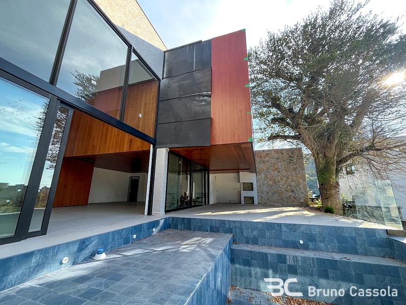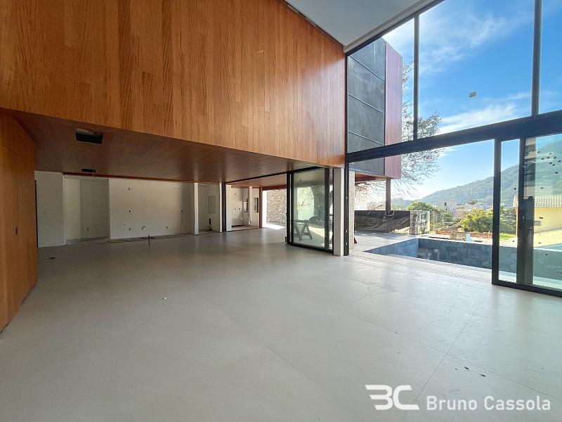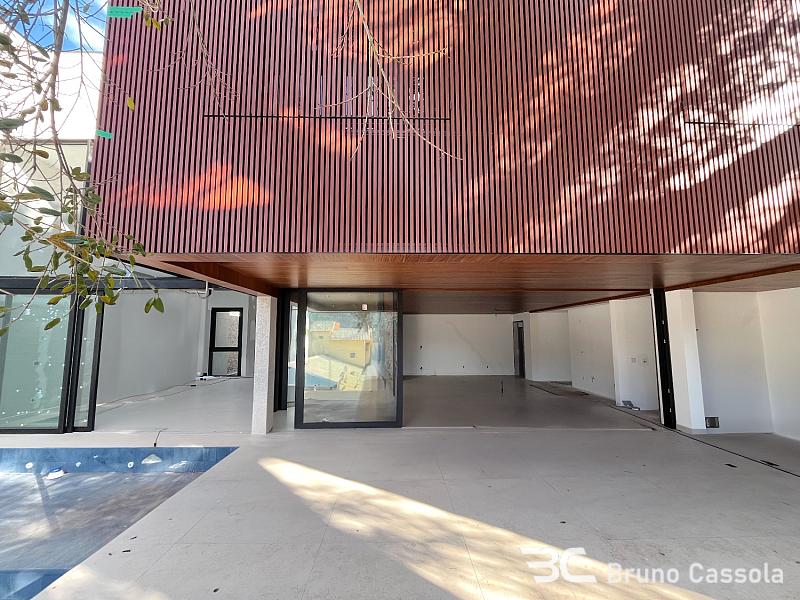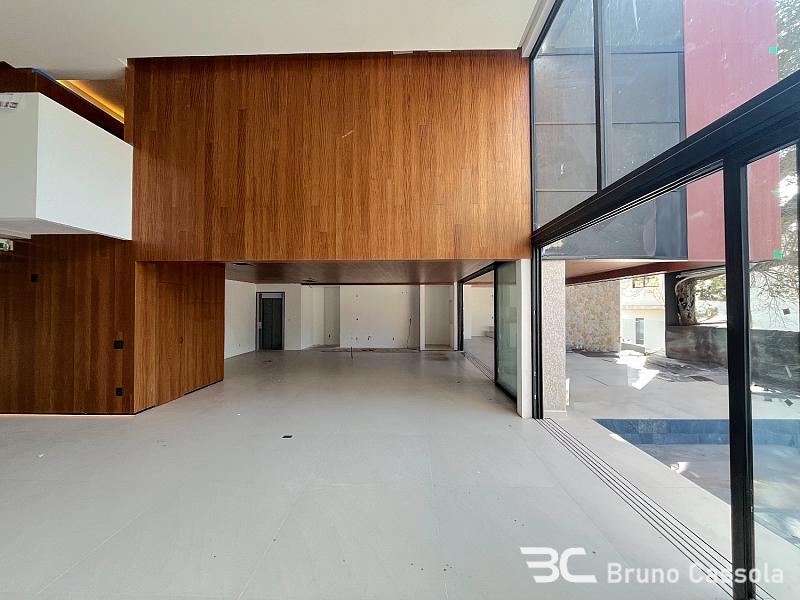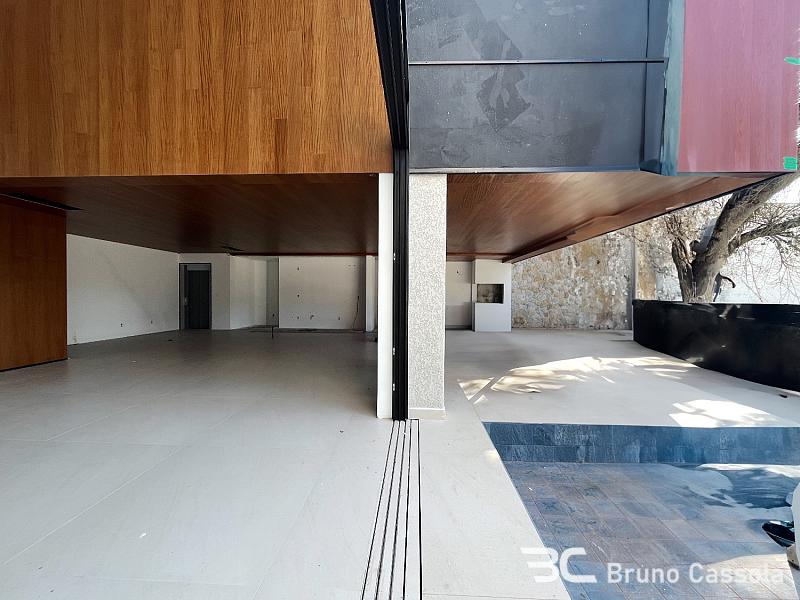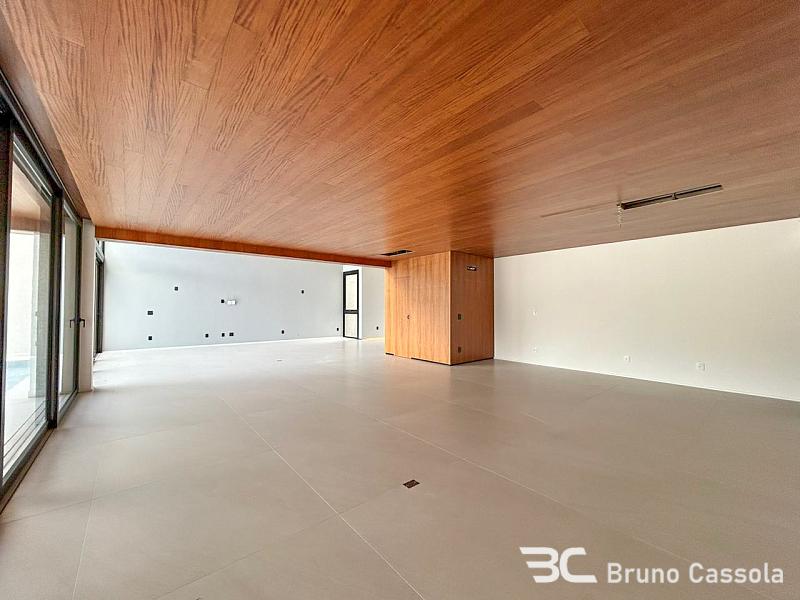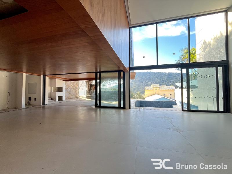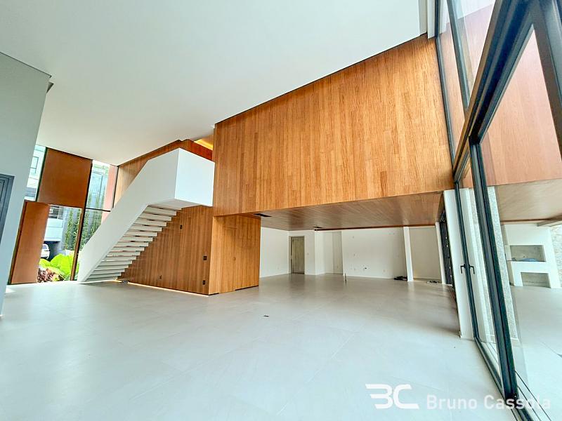 O living integrado com pé direito duplo e mezanino oferece total funcionalidade, com estar, sala de jantar e uma cozinha gourmet com churrasqueira a carvão, além de total integração com a varanda, criando espaços amplos e conectados, ideais para convívio e lazer. A área externa é um verdadeiro refúgio, com piscina de borda infinita, hidromassagem, lounge com lareira e um jardim com paisagismo cuidadosamente planejado. Além disso, o imóvel dispõe de uma cozinha fechada, ampla área de serviço e uma dependência completa.