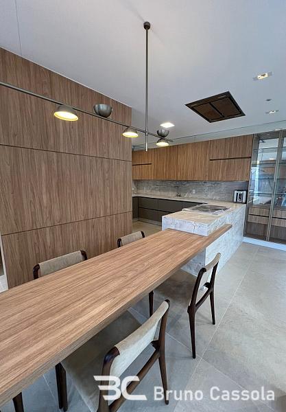 Cozinha: Bancada em quartzo e coifa clean embutida no teto (Electromec).