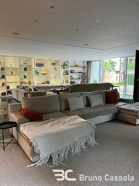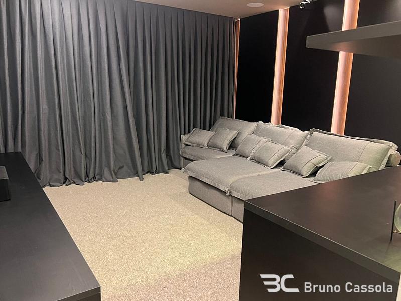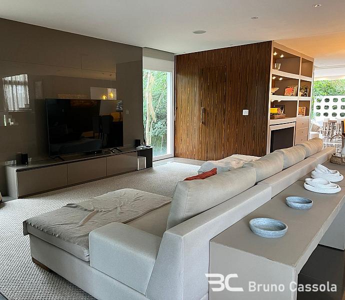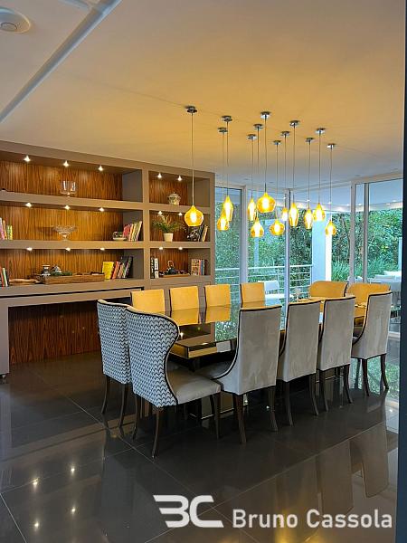 Casa alto padrão à venda no Condomínio Porto Riviera, com 873 m² de área privativa, 5 suítes sendo uma master com 2 closets e 2 banheiros, ampla área externa, piscina privativa, sala de estar com lareira, cinema, área gourmet com churrasqueira a carvão e parrilha, além de garagem para 6 veículos.