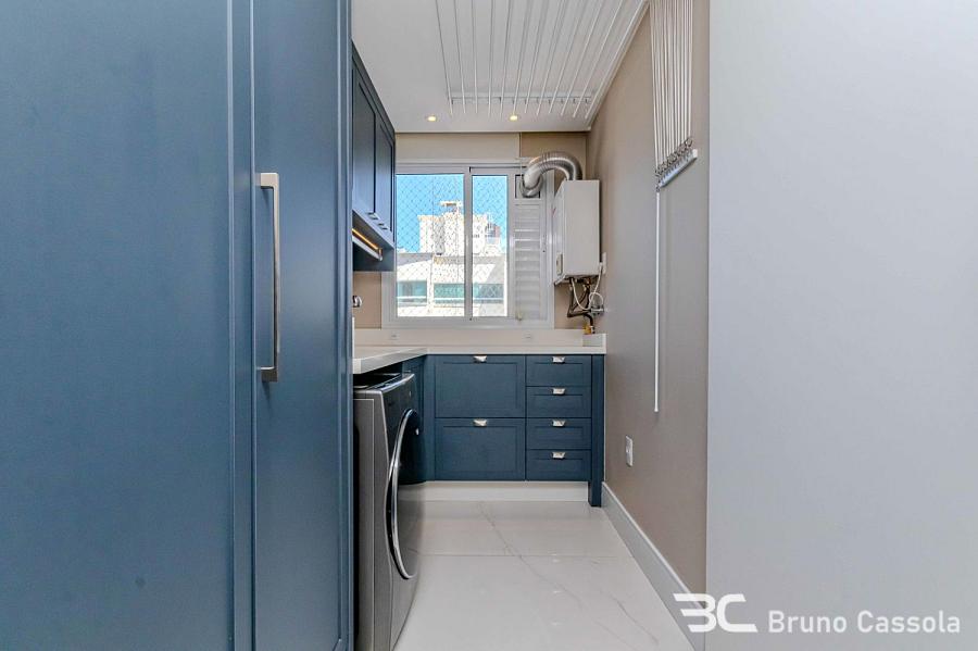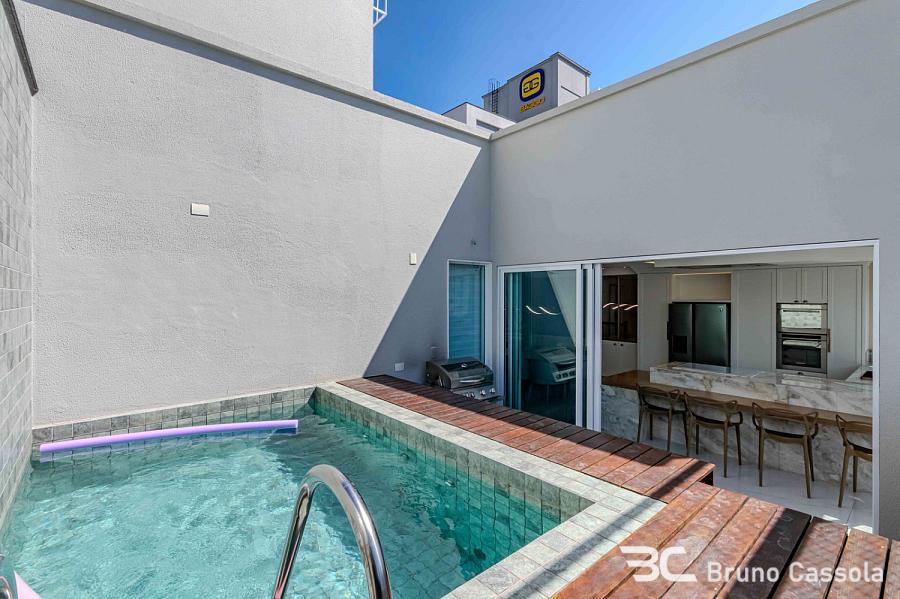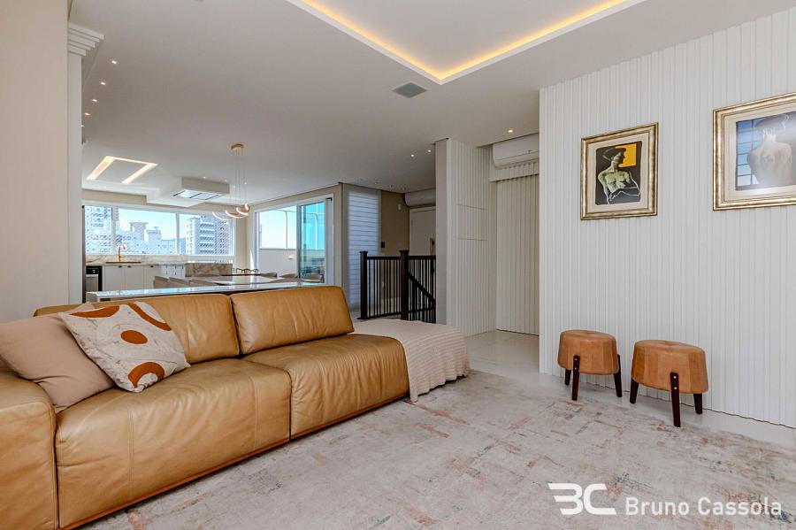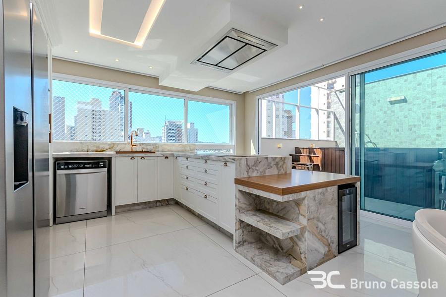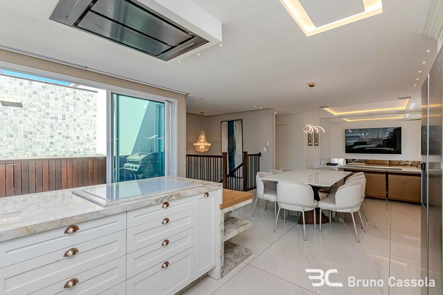 Cobertura duplex à venda no Edifício Porto Di Bari, em Balneário Camboriú. A unidade possui 185 m² de área privativa, três suítes, sendo uma suíte master com closet, e três vagas de garagem. O imóvel é comercializado totalmente mobiliado e decorado, com área social integrada que inclui churrasqueira americana e piscina aquecida privativa.