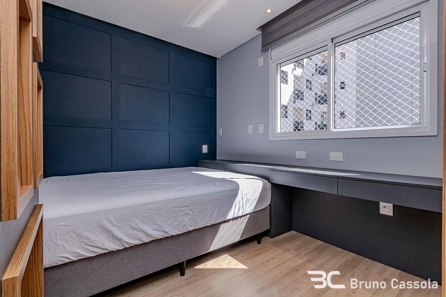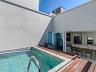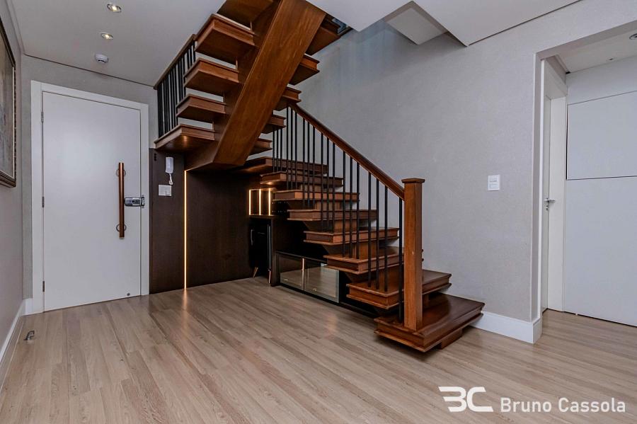 O acabamento interno contempla móveis planejados, climatização e revestimentos em todos os ambientes. A planta é dividida em dois pavimentos, separando a área íntima da área de convivência e lazer privativo. A unidade está disponível para visitação imediata conforme a configuração atual de mobília e equipamentos.