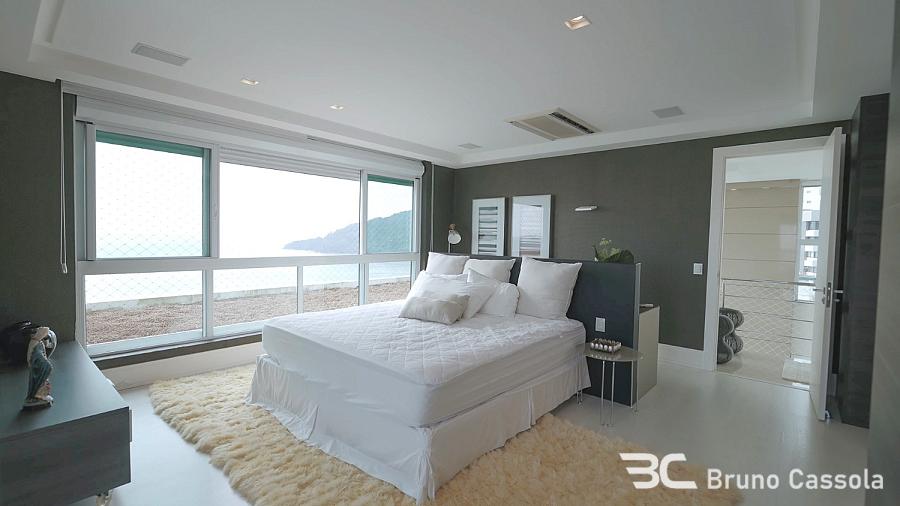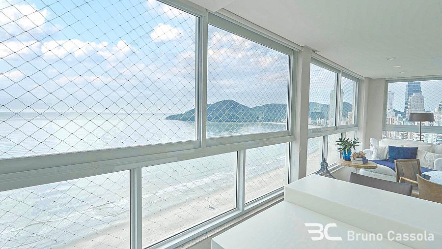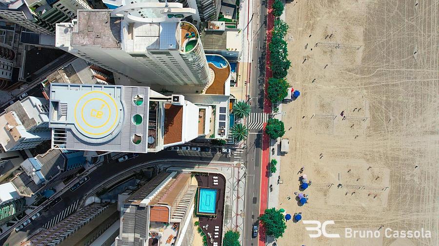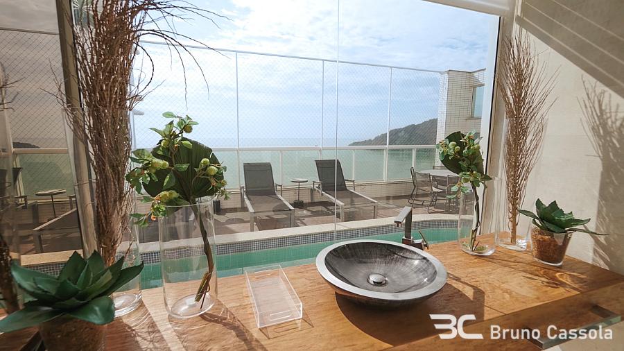 Cobertura Triplex frente mar, pé direito duplo no living, elevador interno, 4 suítes sendo uma master com walk-in closet, terraço com piscina privativa, hidromassagem e vista panorâmica para toda a praia, churrasqueira, dependência de serviço, 5 vagas de garagem.