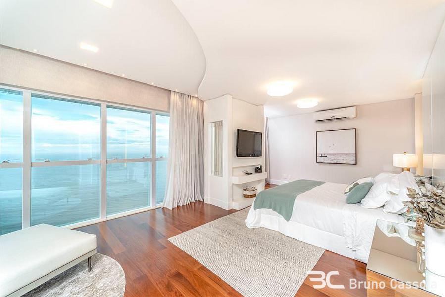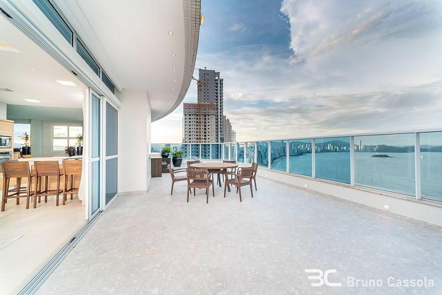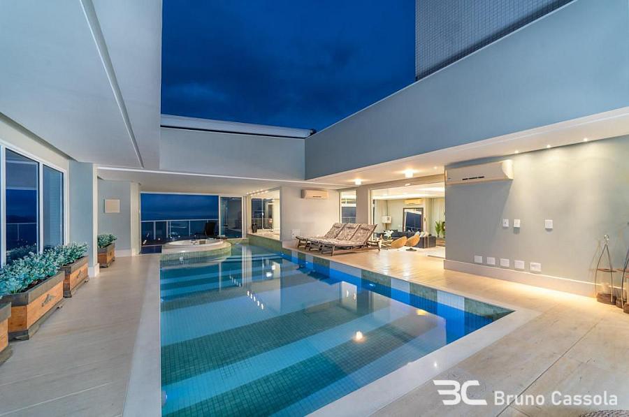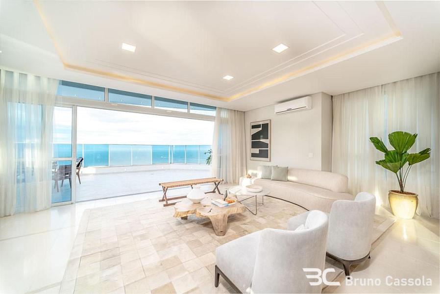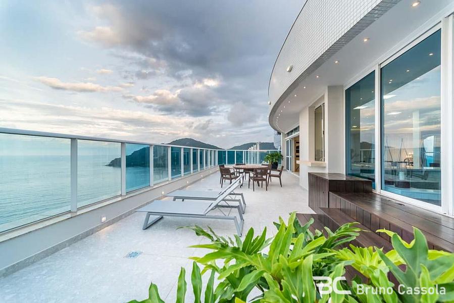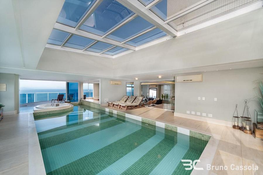 Ampla cobertura duplex frente mar com 740 m² privativos, piscina privativa aquecida com teto panorâmico, 5 suítes, 8 vagas e vista panorâmica para toda a praia de Balneário Camboriú.