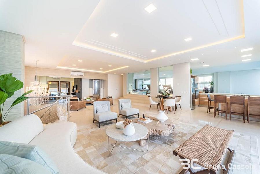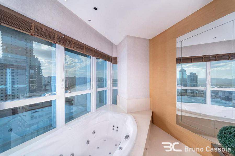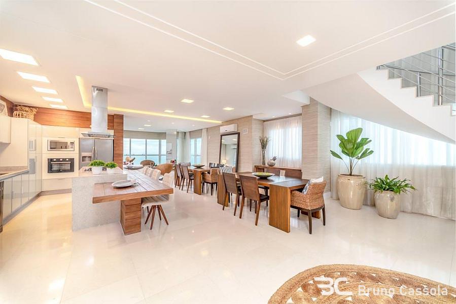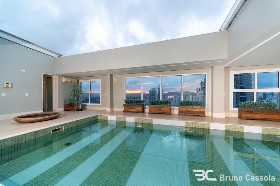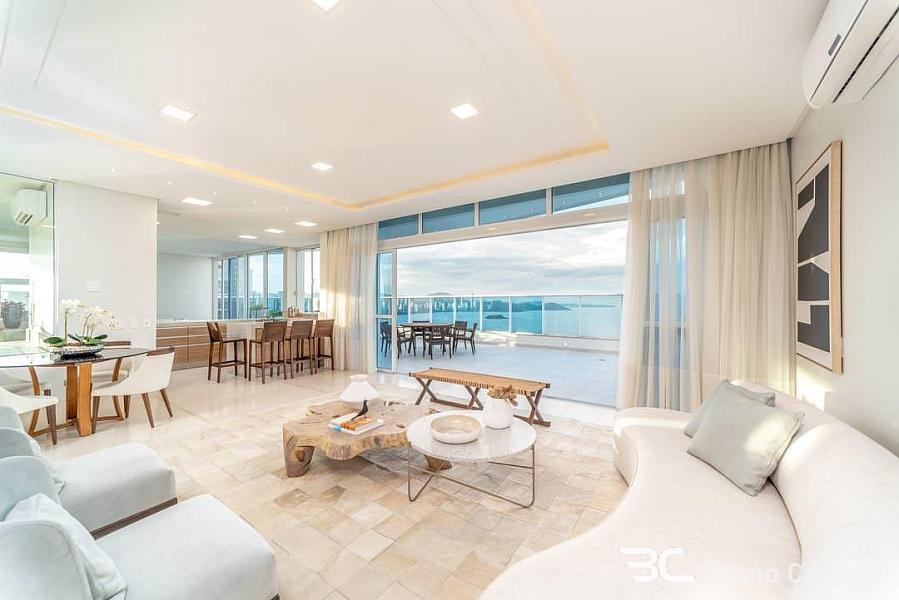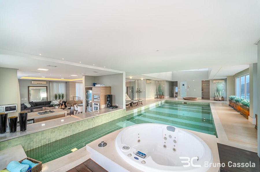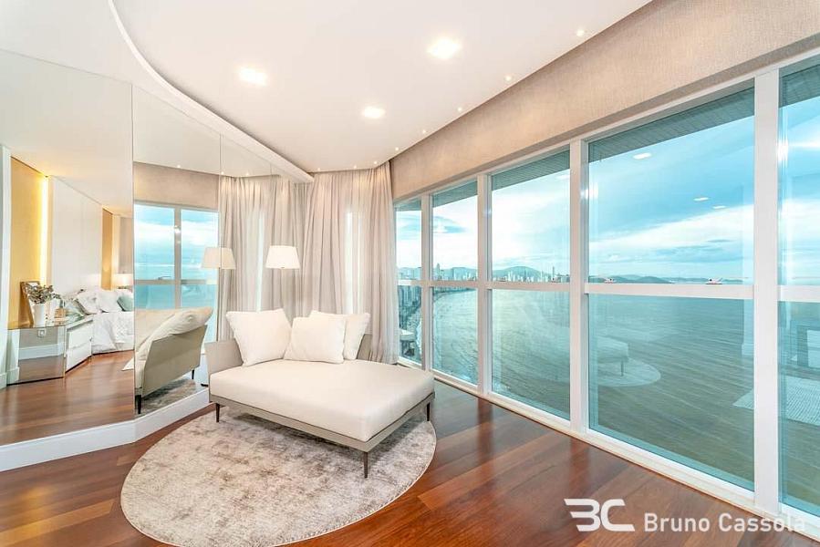 Ampla cobertura duplex frente mar com 740 m² privativos, piscina privativa aquecida com teto panorâmico, 5 suítes, 8 vagas e vista panorâmica para toda a praia de Balneário Camboriú.
