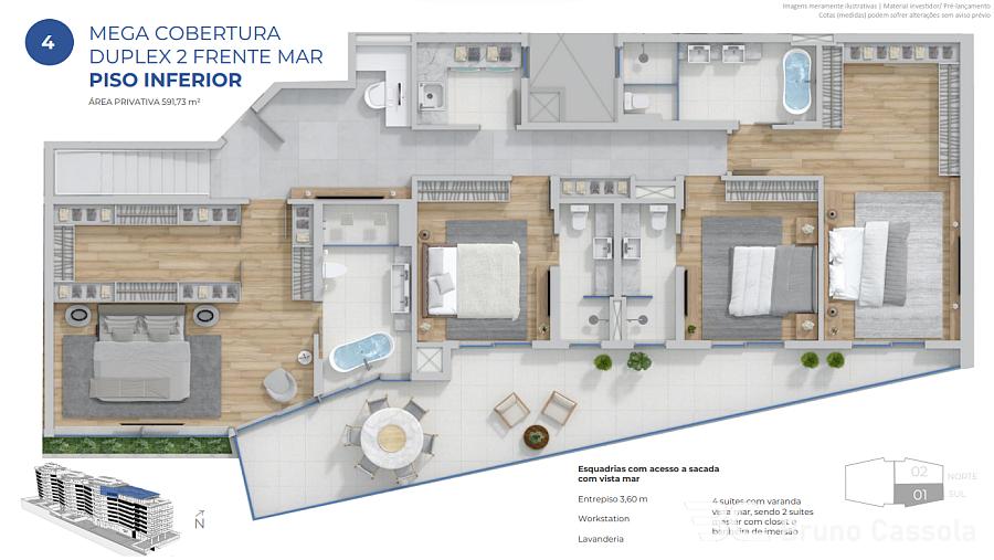 - 4 suítes com varanda vista mar, sendo 2 suítes master com closet e banheira de imersão