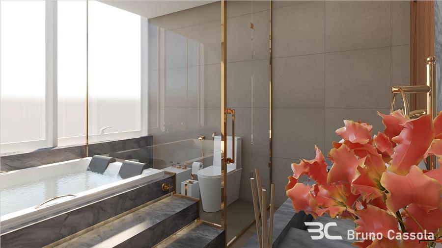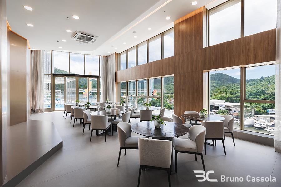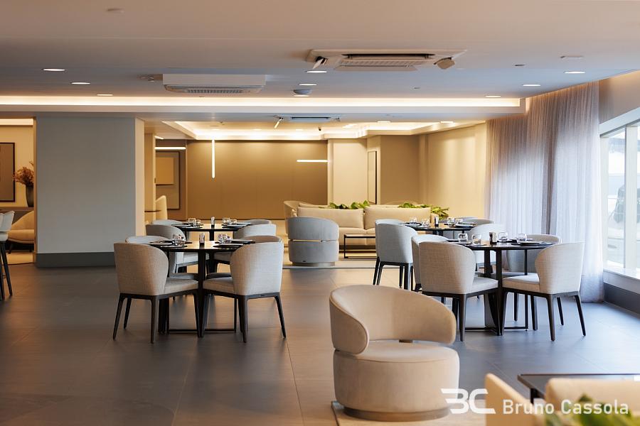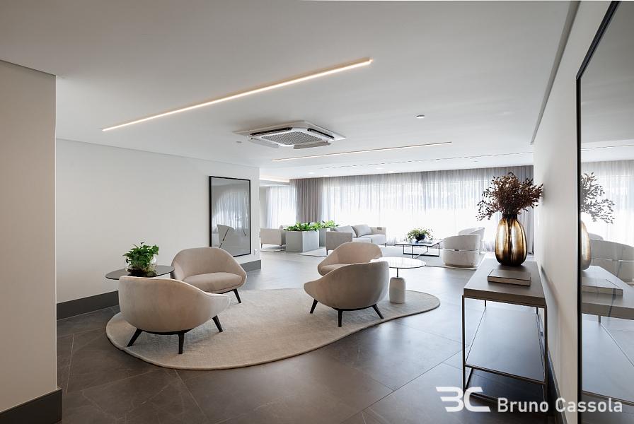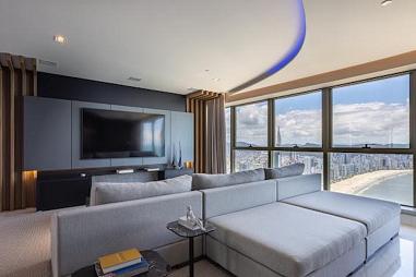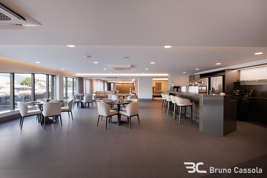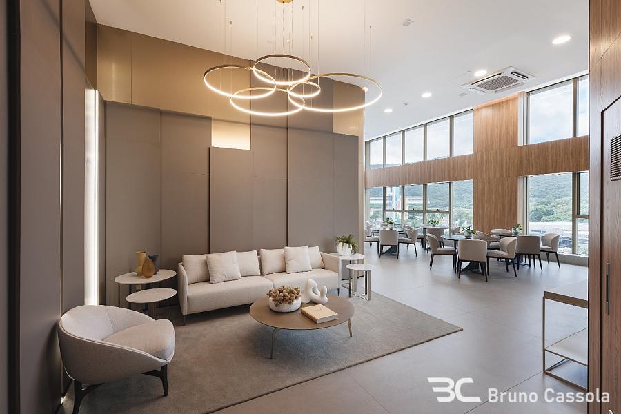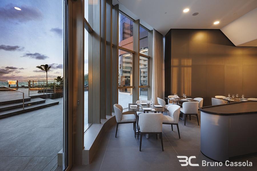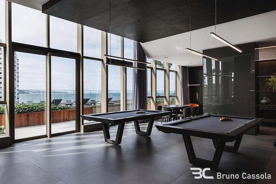 Piso em porcelanato indiano nas áreas comuns do apartamento e vinílico nos ambientes íntimos, portas Trada (eleita a melhor do país, com isolamento acústico e madeira maciça laqueada), infraestrutura para aspiração central, automação e aquecimento nos pisos dos banheiros. Com uma testada de 40 metros de frente para o mar, oferece vista panorâmica, de um lado para a praia e de outro para a Mata Atlântica e Marina.